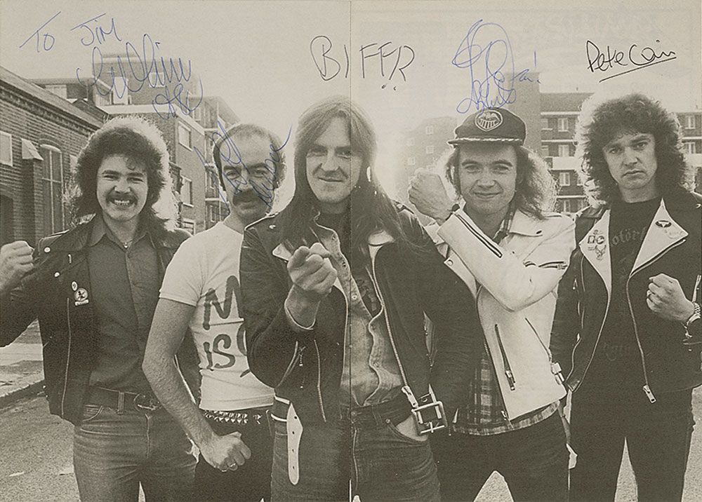 Wheels of Steel tour program, 8.25 x 11.75, signed in ballpoint and ink on the inside group centerfold by Biff Byford, Paul Quinn, Graham Oliver, Steve Dawson, and Pete Gill, with one adding a brief inscription. In fine condition, with a light diagonal crease to front cover. Accompanied by a full letter of authenticity from Roger Epperson/REAL.