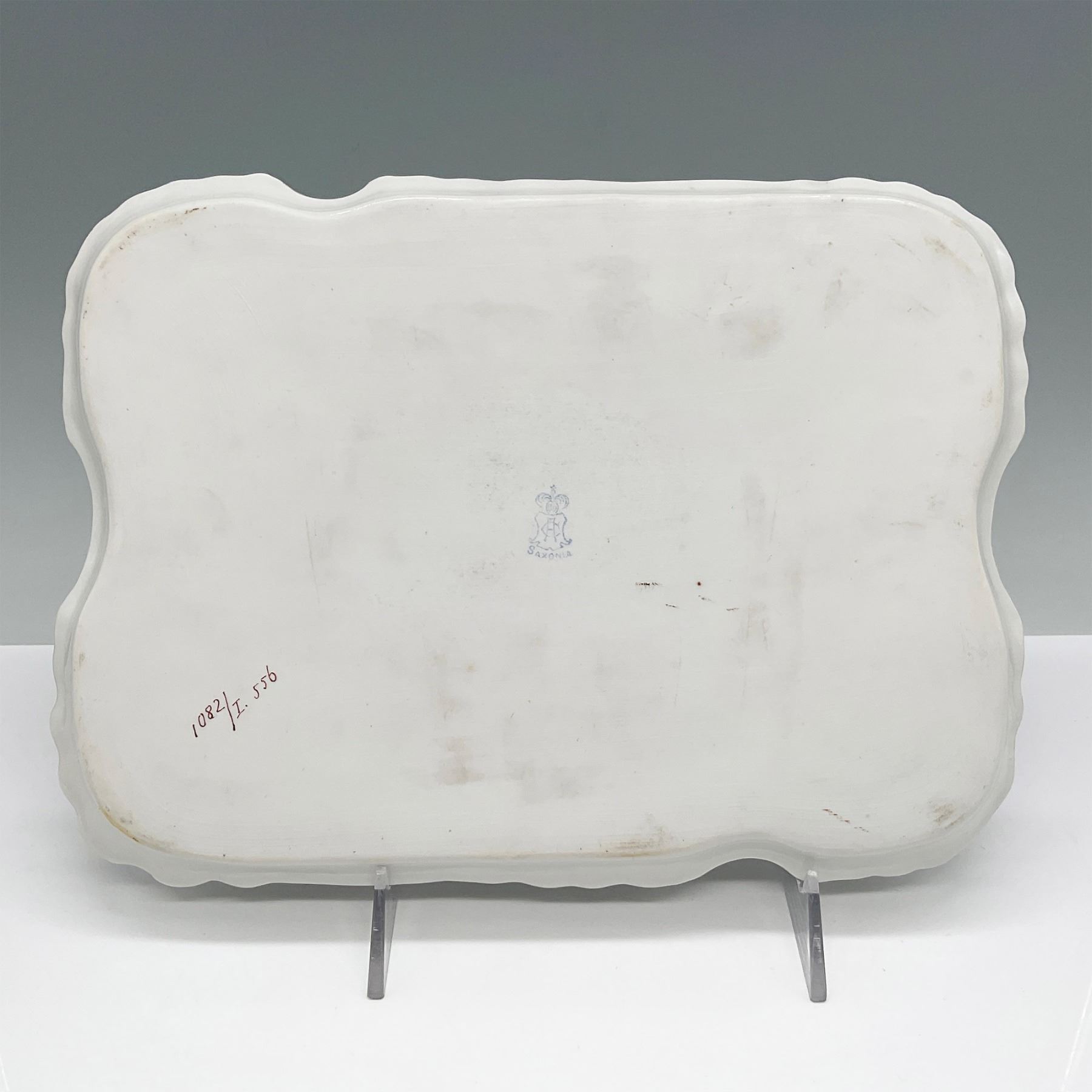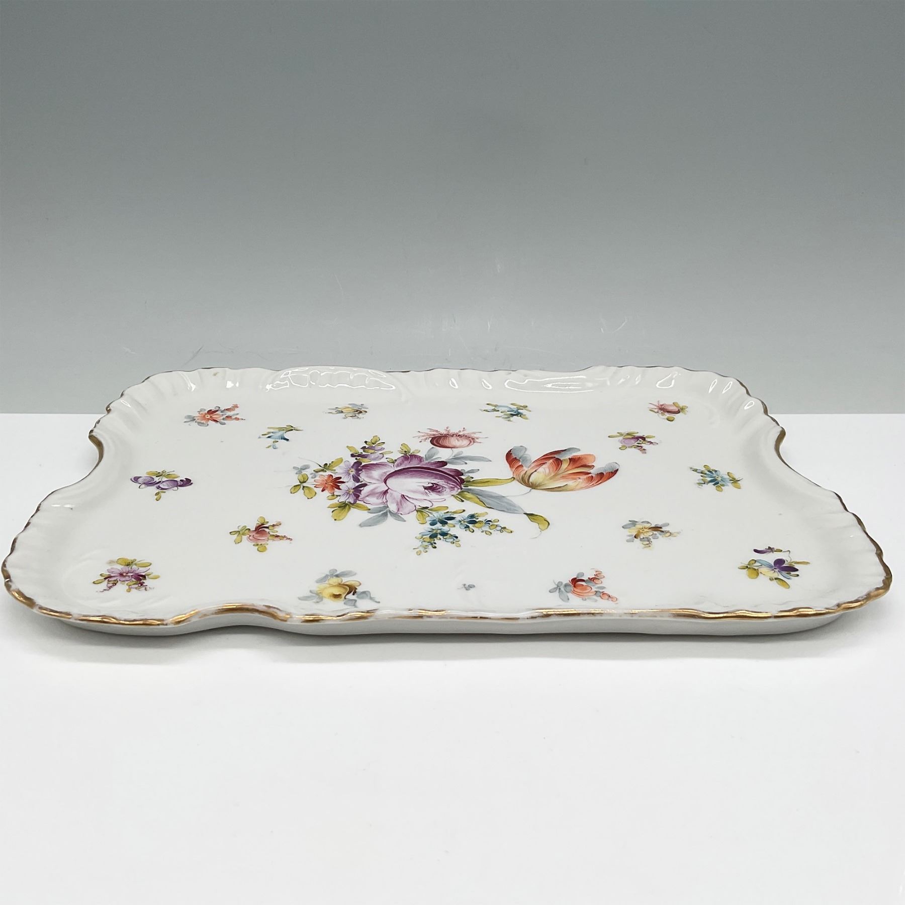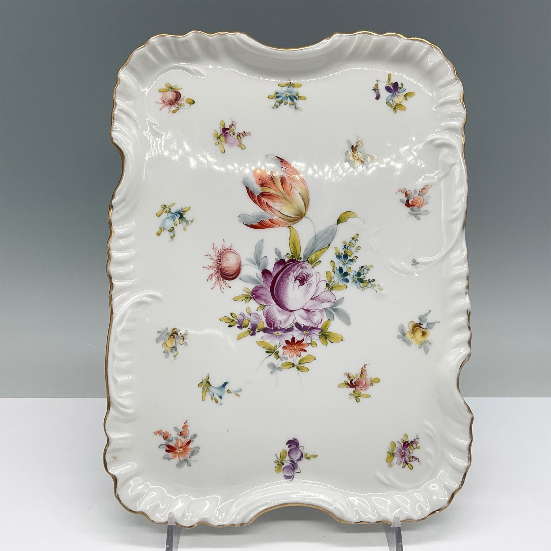 Exquisite Saxonia hand-painted porcelain tray featuring a scalloped edge with gold trim and a vibrant floral motif. The central bouquet, accented by smaller blossoms scattered across the surface, showcases delicate hues of purple, orange, blue, and yellow. The elegant shape is enhanced by intricate relief detailing along the rim. The underside bears the Saxonia porcelain backstamp, signifying its authenticity and craftsmanship.