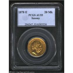Saxony. Gold 20 marks 1878-E, Head right/Eagle with date and value, F-3841, KM-184, AU55 PCGS. Very.