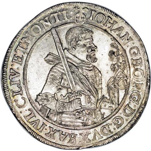 <B>Saxony. Johan Georg I Taler 1625, </B></I>KM132, Davenport 7601, choice UNC, fully lustrous with incredibly sharp details and mellow champagne toning in the legends. Rare and highly desirable quality for this era.