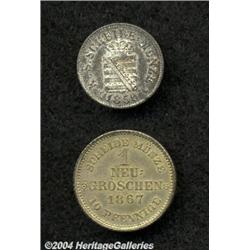 <B>Saxony. Lot of Two Coins,</B></I> KM254 1/2 Groschen 1856 AU and KM256 Groschen 1867 AU. 2 coins <BR><BR><B>Important notice:</B> Heritage usually auctions material at the rate of 200-250 lots per hour. On some occasions eBay Live bid software or the Internet may not be able to keep up with the pace of the auction. We recommend placing a realistic absentee bid now as insurance to avoid disappointment. Occasionally the auctioneer may eliminate or reject an eBay Live bid, and the auctioneer may also reopen a lot after the close of the eBay live bidding (usually because we missed an audience bid), and may reject your bid even if it shows you as the winning bidder. By bidding via eBay Live, you agree that Heritage may award the lot to another bidder at its sole discretion under the circumstances described above or any other reasonable circumstances. Since eBay bids are not shown to us until we open the lot on the floor, we treat those bids just like floor bids. In most cases the floor responds before the eBay bid is presented to us, due to Internet lag time, so for consistency we have made it a policy that floor bids are always considered first over tie eBay live bids. Also please note that all Heritage lots purchased through eBay Live carry a 20% Buyer's Premium. Please make sure you read the Terms and Conditions before you bid.