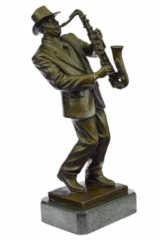 The unique statue will bring an added touch into any room in your home or office. Cast bronze sculpture features the forms of a saxophone player and saxophone. The statue is cast using the sand-casting method. Dimensions: Height 12 X Width 5 inches. Weight: 7 LBS.