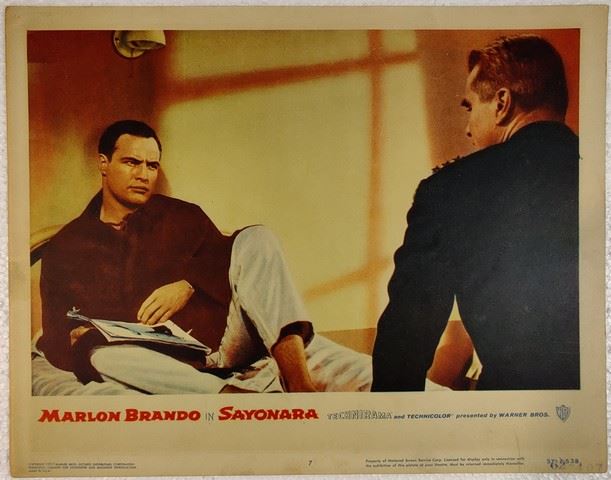 Sayonara (Warner Bros., 1957) lobby card. Drama, Korean War. Starring Marlon Brando, Miiko Taka, Red Buttons, Miyoshi Umeki, James Garner, Ricardo Montalban, Patricia Owens, Dennis Hopper. Directed by Joshua Logan. Very minor edge wear, very minor creases. Near Mint. (11"x14").