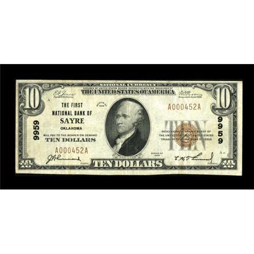 <B>Sayre, OK</B></I> - $10 1929 Ty. 1 <B>The First NB</B></I> Ch. # 9959<BR> A scarce bank in small size, with this by far the nicest example of the six listed in the census. Bright <B>Very Fine,</B></I> with signatures of J.L. Thurmond and C.K. Thurmond.<BR><BR><b>Shipping:</b> Coins & Currency (<a target="_blank" href="http://www.heritageauctions.com/common/shipping.php">view shipping information</a>)