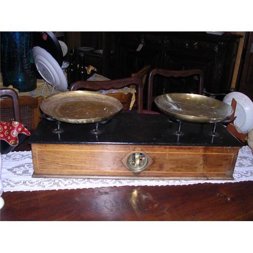 Wonderful scale from France. Wood frame has some inlay trim. Top is painted and trays are in brass. This scale is in good condition and actually works. There are some typical imperfection due to use and age but it only adds charm to this lovely scale. Please feel free to ask for more detailed photos. Imported from the sarthe region of France.