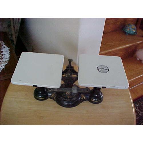 Scale,Fairbanks(balance), signed on two sides, embossed also in gold letters; Knott, Boston on bottom; 2 porcelain 6 X 6 trays; signed on top with World Globe Fairbanks; standard weighs up to 5 lbs. plus ounces; thumb adjustment for balance ; size 14" X 6" X 7" tall; original black paint and gold leaf trim; No weights.