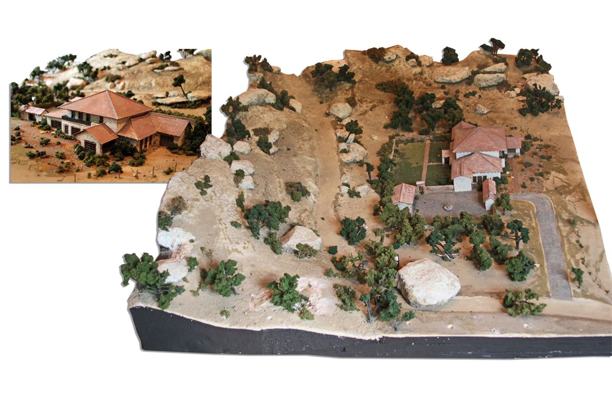 Model of the ranch from ''Casa de Mi Padre.'' Will Ferrell's spoof of Spanish-language soap operas was shot on a low budget of 6 million dollars; in lieu of costly aerial shots of a real ranch estate, production commissioned this model. Detailed scale model features the ranchero property and outbuildings set upon realistic desert-scape topography, complete with elevated rockfaces and chaparral. A classic courtyard with a fountain in the center lies adjacent to the home. A dirt road curves along beside the structures. Stucco buildings are each traditionally roofed in faux terra cotta. Four horses add life to the model. The estate was at the heart of the plot, as Will Ferrell's character and the other protagonists fight to pay off their father's debts in order to keep it in the family. Main house measures 16'' x 10.5'' and 5.5'' in height. Scene is mounted to a wooden frame and overall measurements are 70'' long by 45'' wide. It stands 18.5'' tall at its lowest and 30'' at its highest. Some nicks to the stone and breakage to the scrub, else near fine. With COA from It's a Wrap.