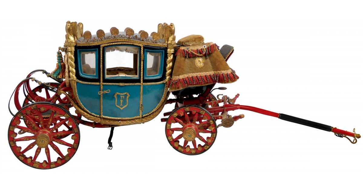 Scale model Napoleonic carriage, Award Winning Miniature Model built for the Fisher Body Craftsman's Guild for a University Scholarship, c.1932, elaborate details & very fine craftsmanship, wood w/orig red, black & teal paint, velvet lined, Exc orig cond, 11"H x 9"W x 18"L (excluding tongue).