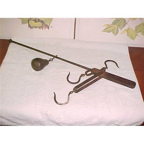Scales, Stillards for weighing beg grain-meats-etc.; 3 hooks , a choic of short med and large weighing.Signed Bemis and cald Co. , Springfield , Mas.