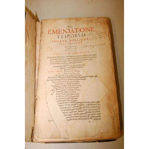 Scaliger, Josephi. De Emendatione Temporum. Folio - over 12" - 15" tall. Hard Cover. Ex-Library. Poor Condition. Circa 1583. SACRED HISTORY and the FOUNDATION OF CHRONOLOGICAL SCIENCE, applying Greek, Hebrew and Ethiopean typography. Covers detached, lacks backstrip, lacks half of the title page, and some or all of the next 5 leaves. Present are leaves #1-4, 4, pages 1-432, 10 index, 2, 1. Lacks portions of the last 2 leaves. Pages have light water stain, edge darkening, pages 155-160 have a mid-page hole, binding loose.