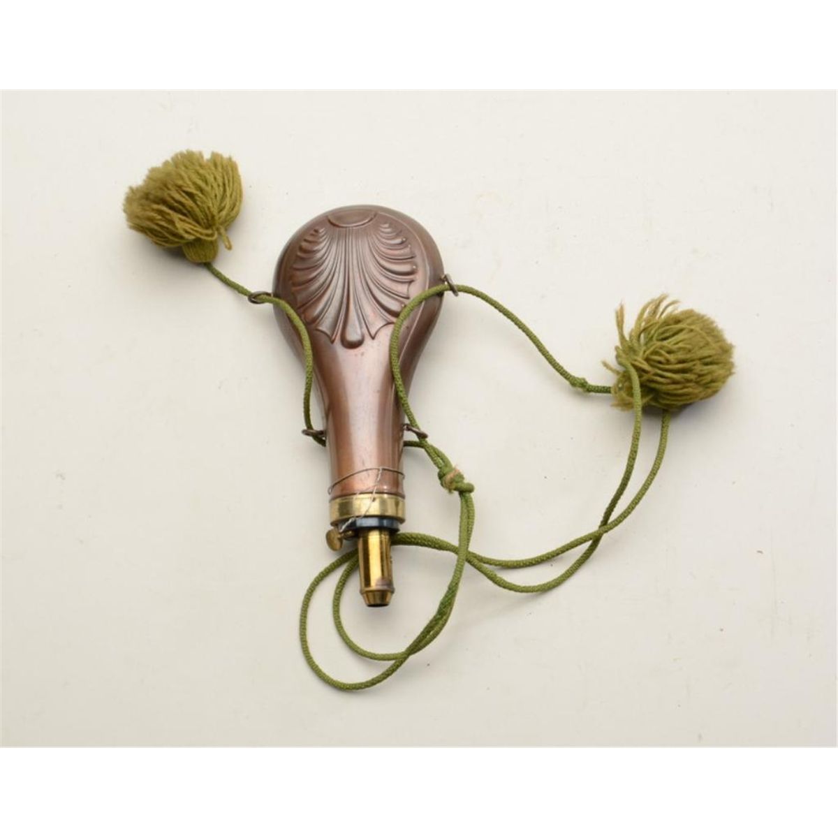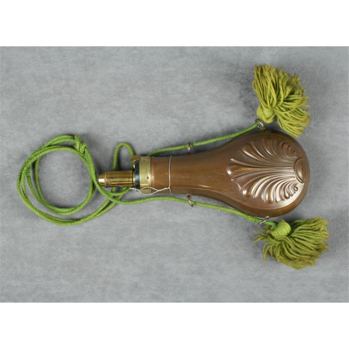 Scallop designed brass shotgun powder flask approx. 8” overall and in fine condition with woven hanger. Est.: $50-$100.