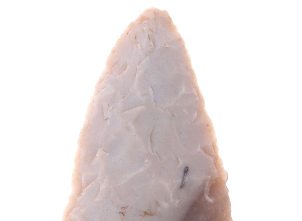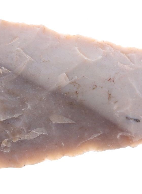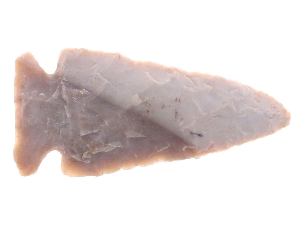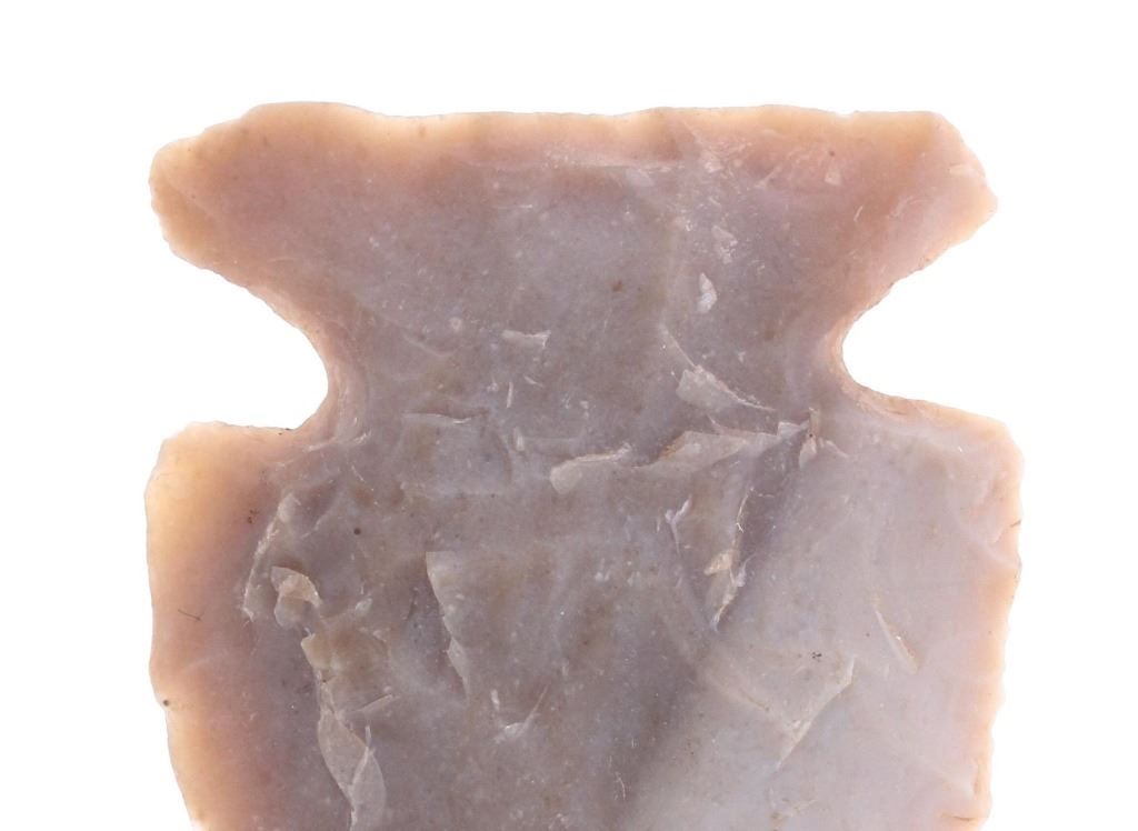 Featured in this lot is this Scallorn Cluster point from the Late Woodland to Mississippian Period and aged from 1,300 - 500 B.P. The point features a thin, small corner notched, triangular point with a cluster cross section measuring 1/4"; it is almost straight. The blade is slightly serrated with share corner notches and a flared shoulder setting. The material the point is knapped from is a flecked off-white and light brown chert material. The condition of this point is good, with no obvious signs of damage. The measurements of this point are 3 1/8" x 1 1/2" x 1/4".