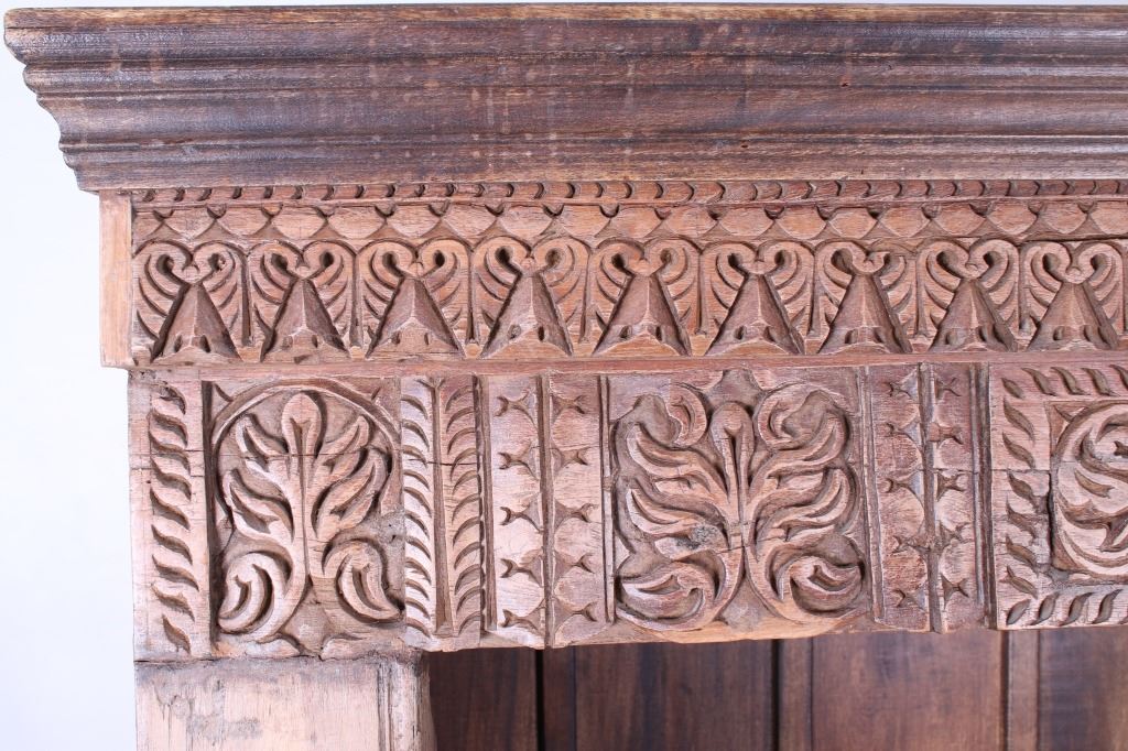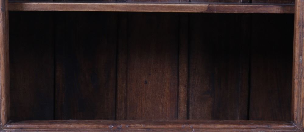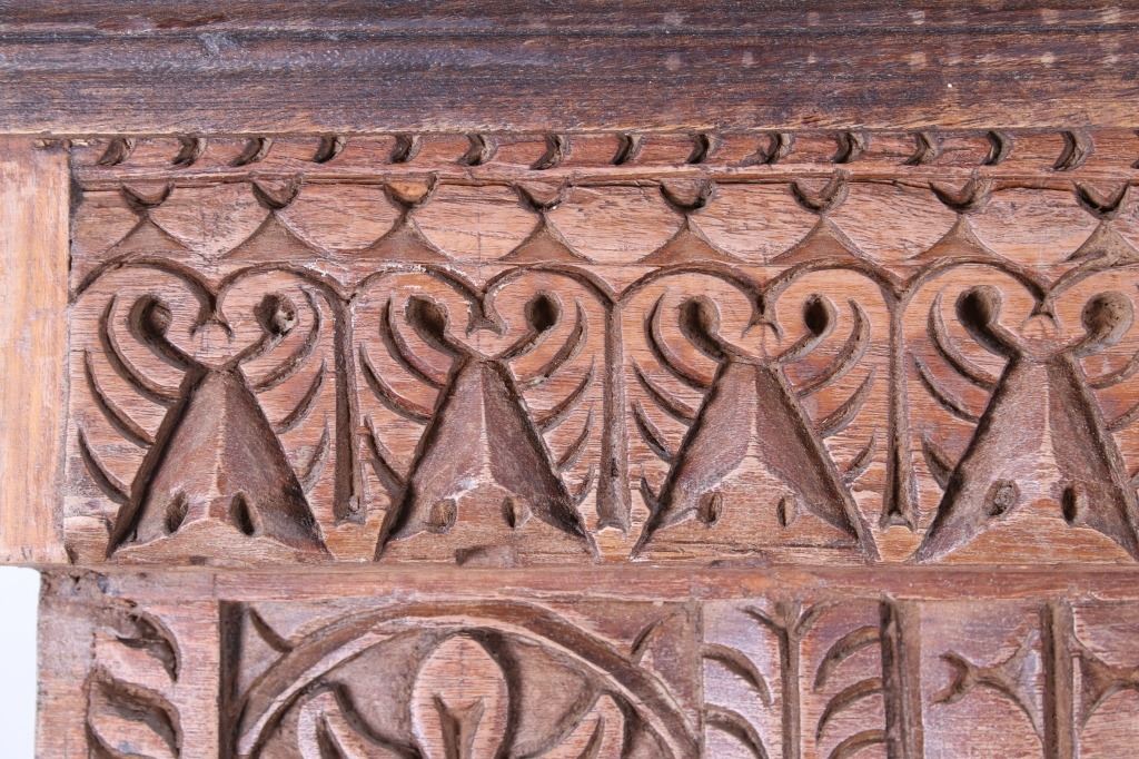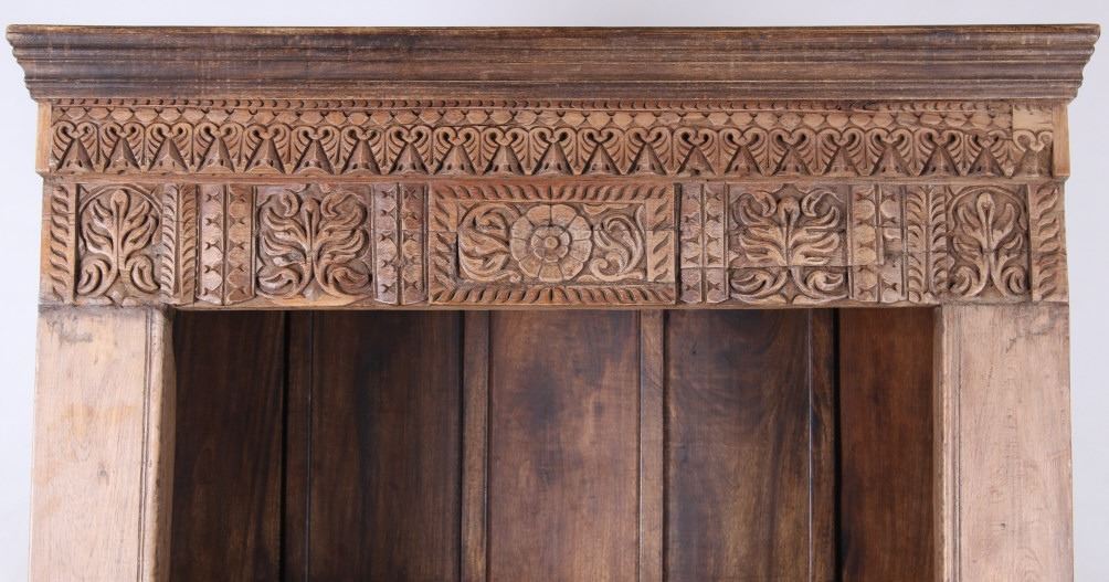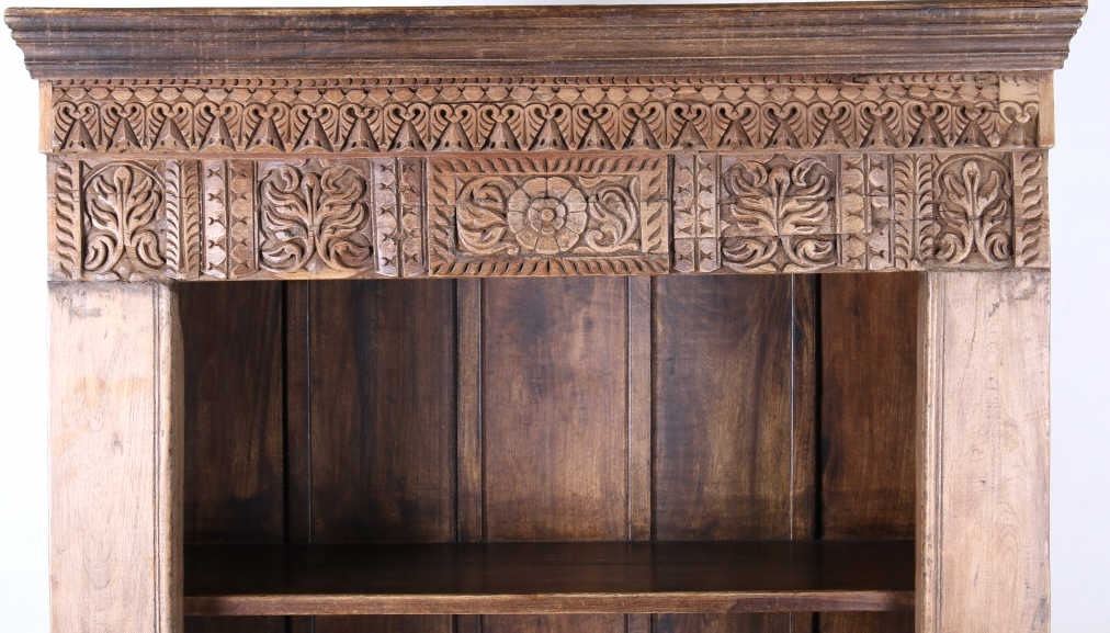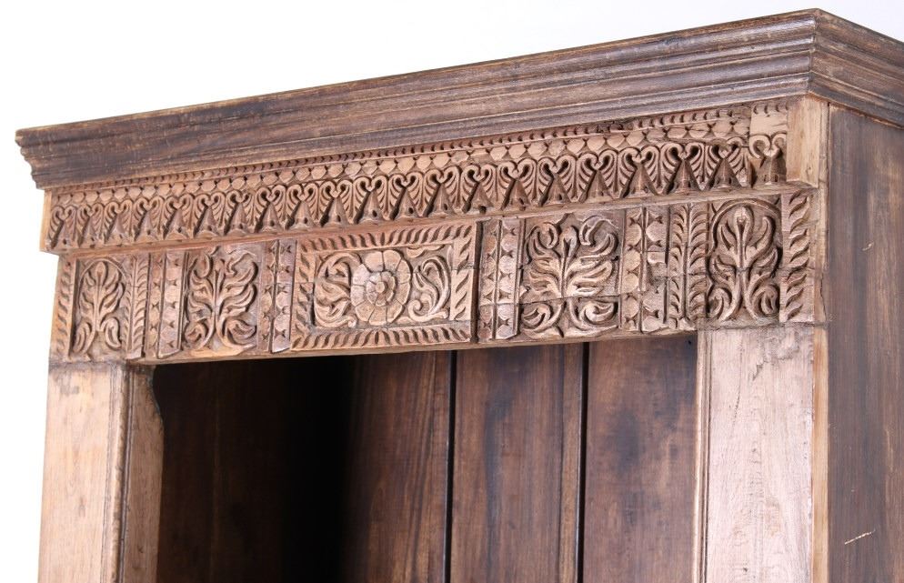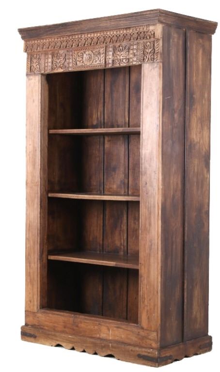 Offered in this lot is a unique Scandinavian high relief carved solid wood shelf. This book shelf has three shelves and a sunken bottom shelf. The hand carving along the top is extremely ornate and of high relief style. There are three parts to the "top" of the book shelf. The up-most part is a beveled trim piece that goes around three sides. The next piece down across only the front is 3 1/4" deep is carved with a triangle and wing style design that has small holes cut into, as if at one time from a piece that had lattice attached. The next section of carving on the front is 5 1/4" deep and has two plant and leaf images on either side of a center flower design. The back wall of the cabinet has four support strips on the inside and outside of the back wall. These pieces add strength as well as style. One support strip is also on each side. The bottom of the cabinet has a scalloped edge to it on three sides with Blacksmith forged strips of iron around the bottom four corners. This piece shows sold wood in old world craftsmanship. The wood is an unfinished with a rich brown tone. This is a great one of a kind piece. Measures 82"T x 46 1/2"W x 21 1/2"D.