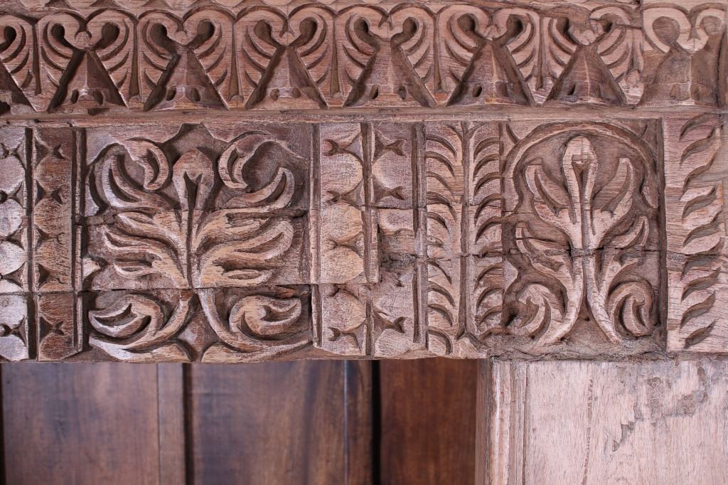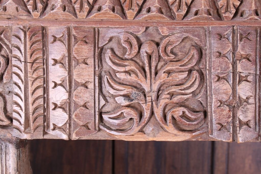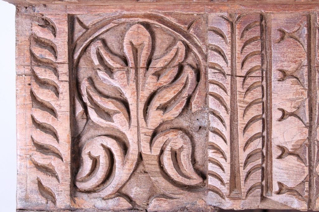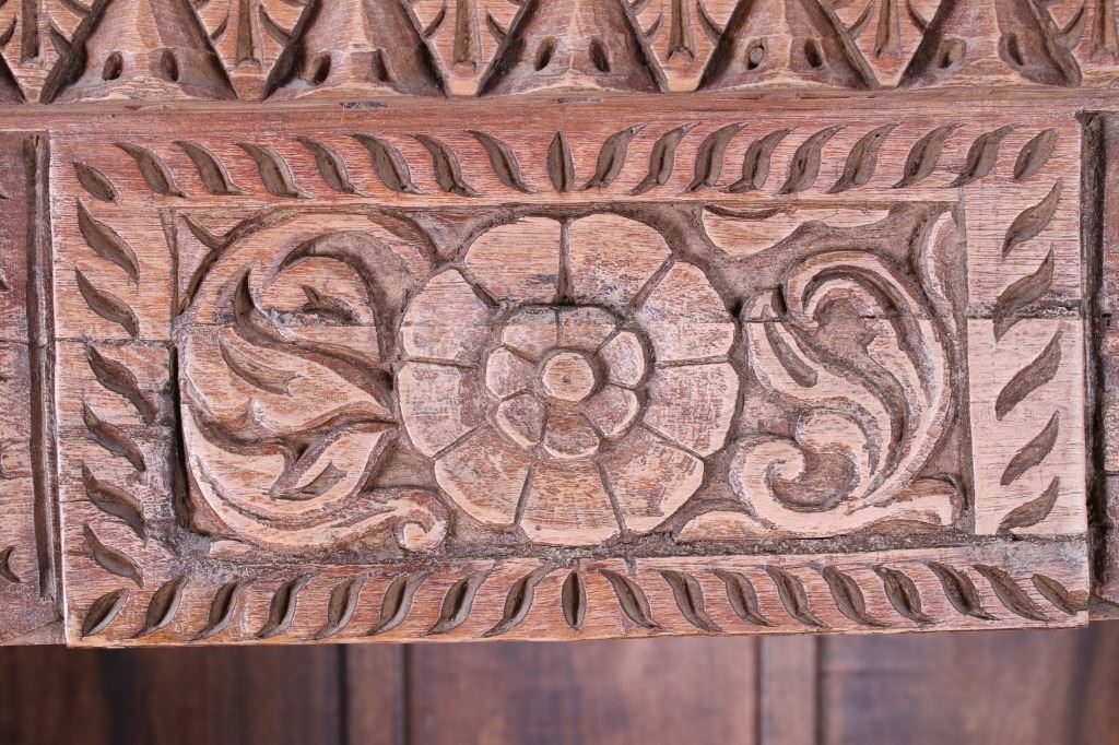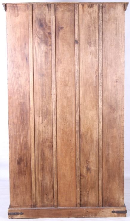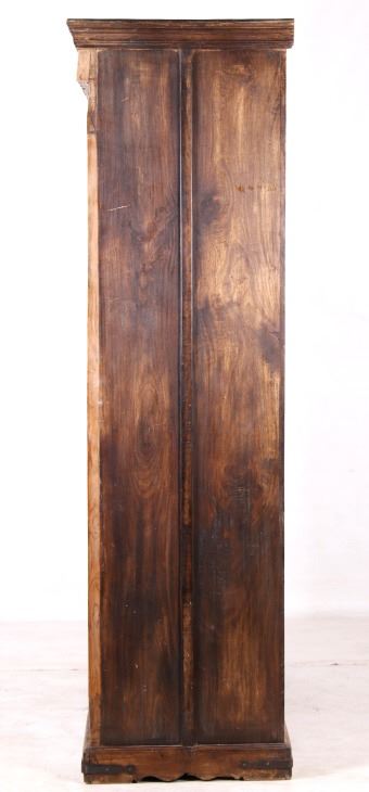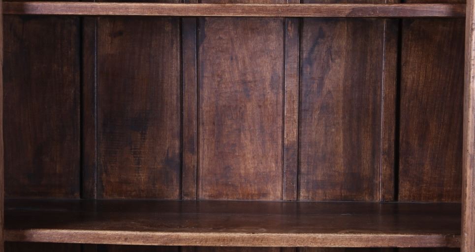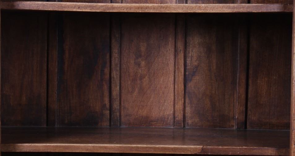 Offered in this lot is a unique Scandinavian high relief carved solid wood shelf. This book shelf has three shelves and a sunken bottom shelf. The hand carving along the top is extremely ornate and of high relief style. There are three parts to the "top" of the book shelf. The up-most part is a beveled trim piece that goes around three sides. The next piece down across only the front is 3 1/4" deep is carved with a triangle and wing style design that has small holes cut into, as if at one time from a piece that had lattice attached. The next section of carving on the front is 5 1/4" deep and has two plant and leaf images on either side of a center flower design. The back wall of the cabinet has four support strips on the inside and outside of the back wall. These pieces add strength as well as style. One support strip is also on each side. The bottom of the cabinet has a scalloped edge to it on three sides with Blacksmith forged strips of iron around the bottom four corners. This piece shows sold wood in old world craftsmanship. The wood is an unfinished with a rich brown tone. This is a great one of a kind piece. Measures 82"T x 46 1/2"W x 21 1/2"D.