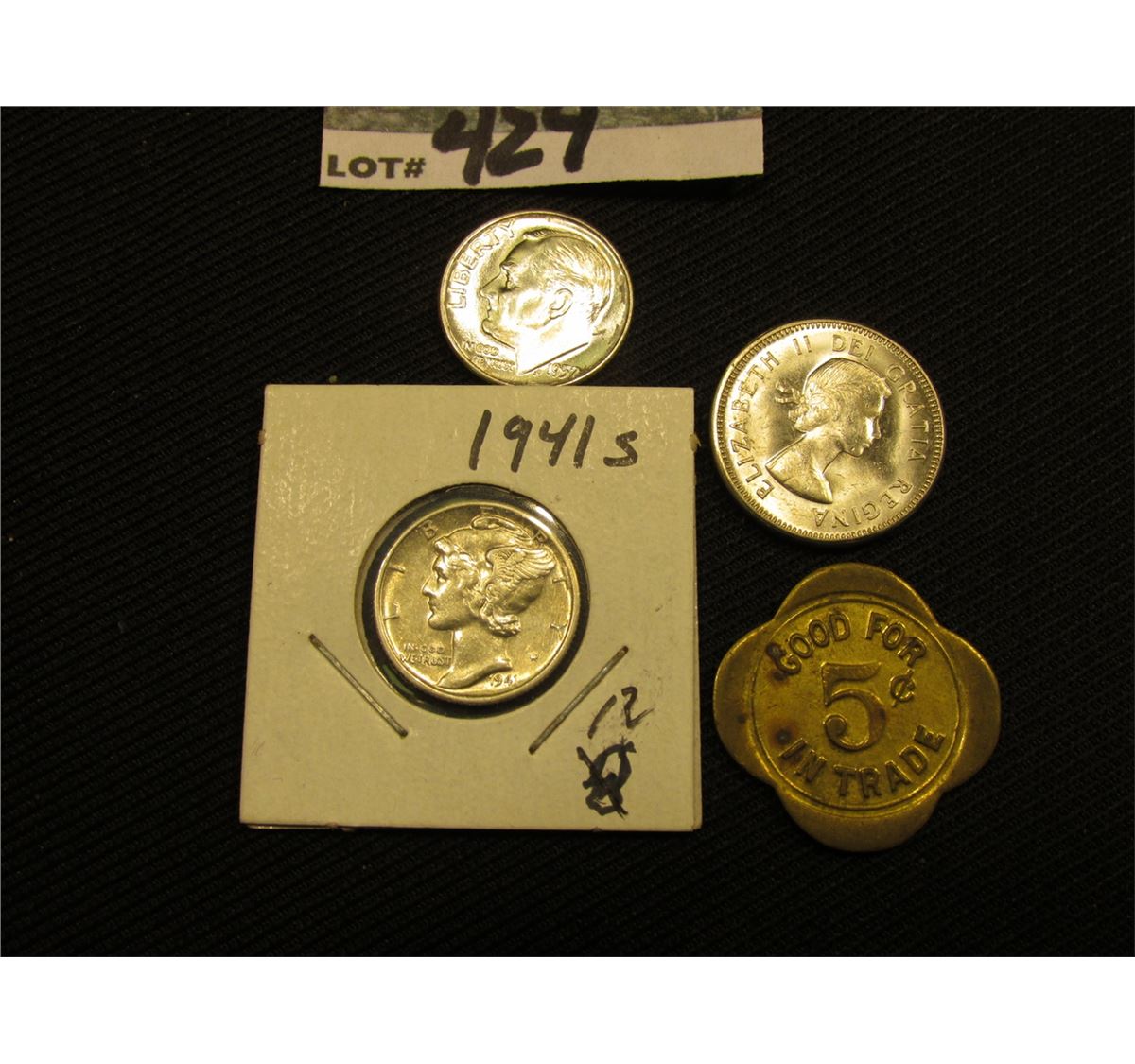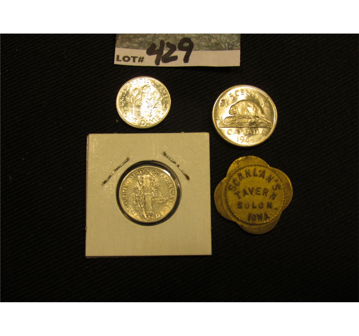 "Scanlan's/Tavern/Solon,/Iowa", "Good For/5c/In Trade", br., 4-sc., Token; 1964 BU Canada Nickel; 1957 D Silver Roosevelt Dime, BU; & 1941 S Silver Mercury Dime, AU.
