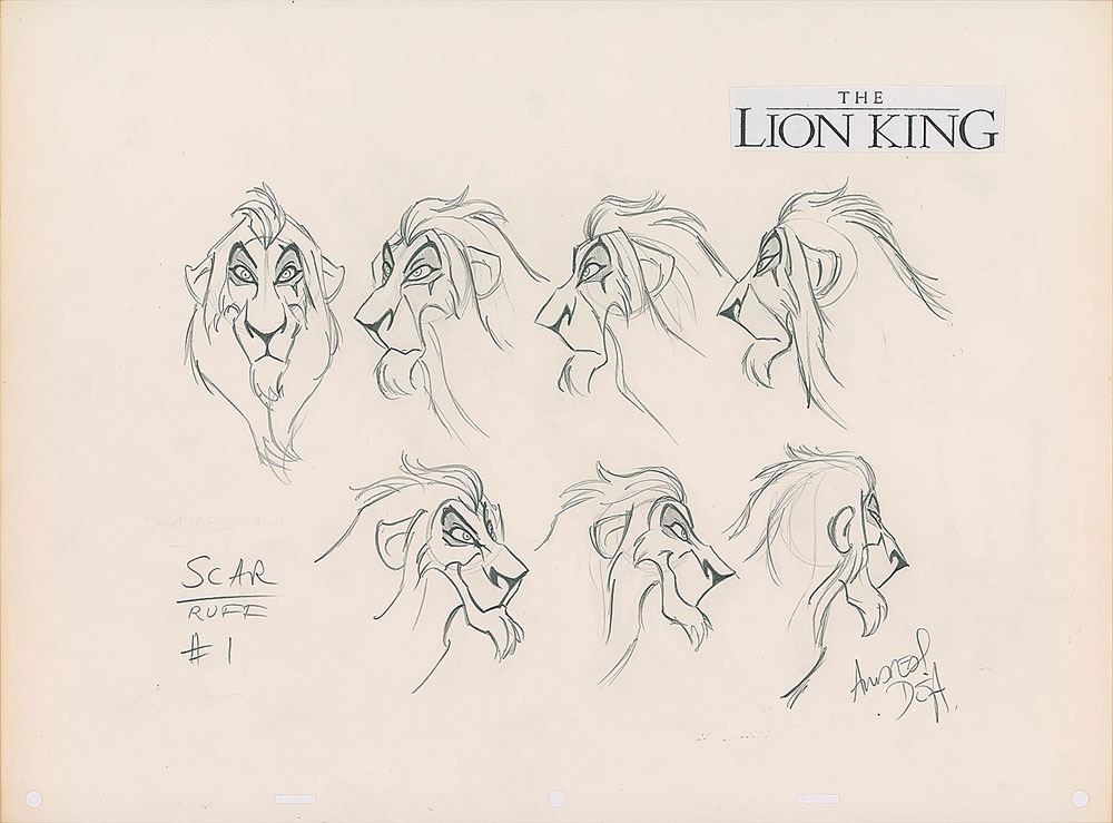 (Walt Disney Studios, 1992) Original character model drawing of Scar's head from seven different angles, accomplished in graphite on untrimmed 17 x 12.5 animation paper. A "The Lion King" label is affixed to the upper right. In fine condition.