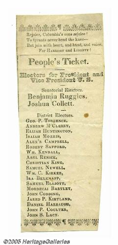 <B>Scarce 1840 "Harrison and Liberty" William Henry Harrison Electoral Ticket</B></I> Before the 1850s it was common for these tickets to appear in newspapers, but blank-backed examples like this, which were actually campaign handouts, are quite uncommon. Excellent condition. Length 5.5". Lot:256