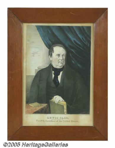 <B>Scarce 1848 Lewis Cass Kellogg Print, "Democratic Candidate"</B></I> A quite uncommon print, and a bonafide campaign item for this very tough candidate. Great condition, in vintage-look wood frame using original (bubbled) glass. 12.5" x 17.5" as framed. Lot:256