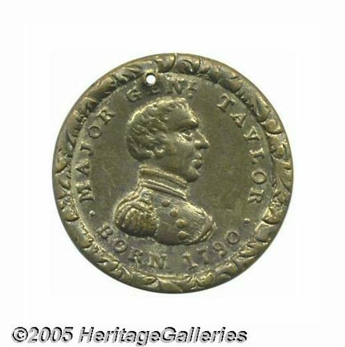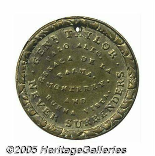 <B>Scarce 1848 Zachary Taylor "Shell" Badge</B></I> This unusual form appeared in 1844, and was used only through the 1848 campaign. Separate brass shell obverse and reverse panels are held together, back to back, by a raised ornamental rim. Choice, nearly uncirculated example with much original luster. This is Sullivan's ZT-1848-19, a scarcer variety than the similar 1848-20 where Taylor looks the other way. 27 mm. Lot:256