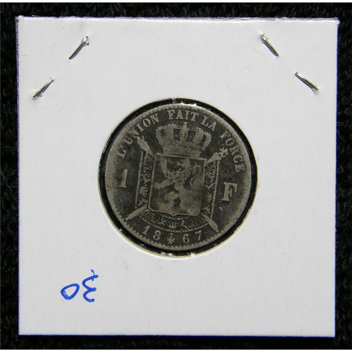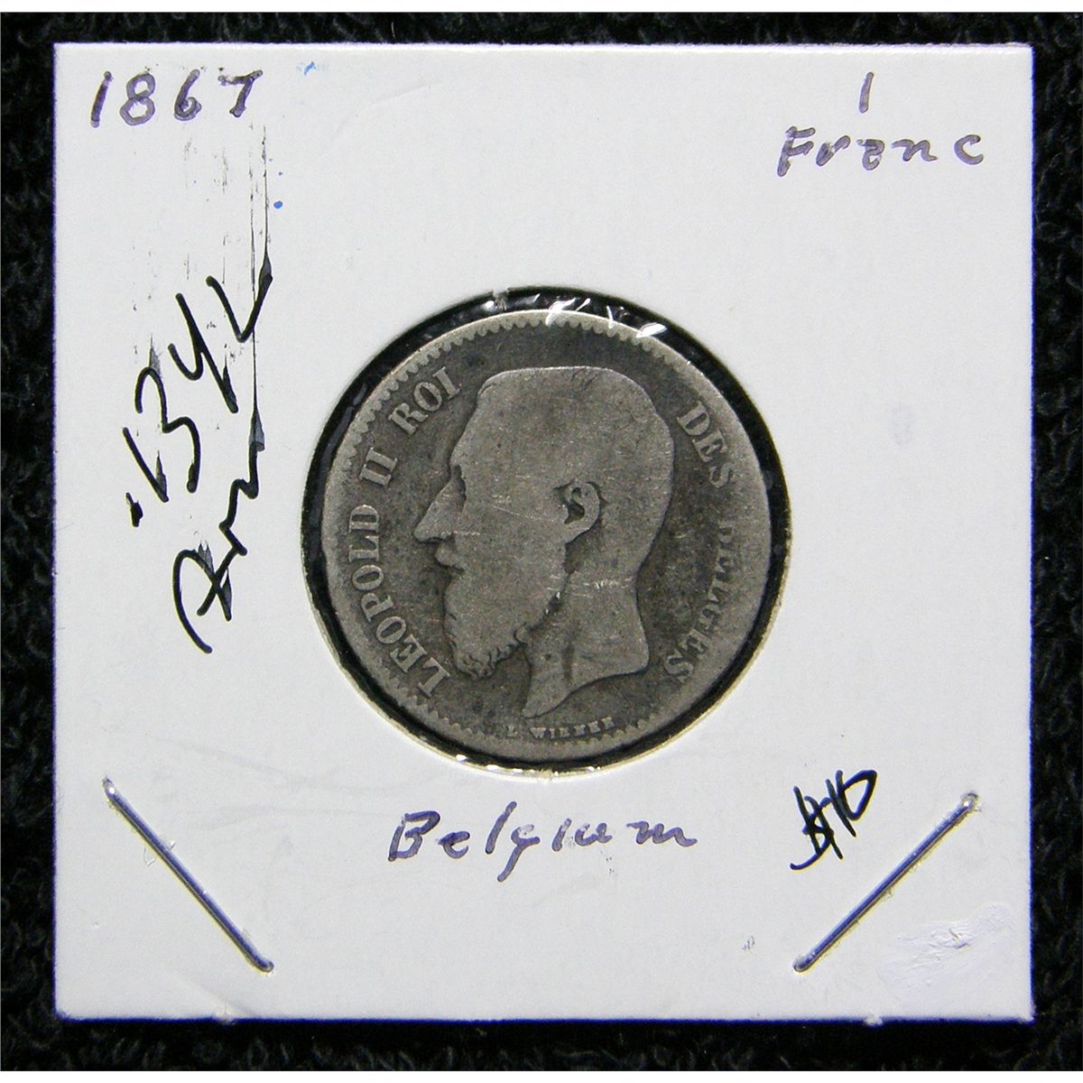 Leopold II Belgian Silver Franc Obverse: Leopold II Reverse: Arms Edge: Reeded KM# 28.1 .1346 ASW