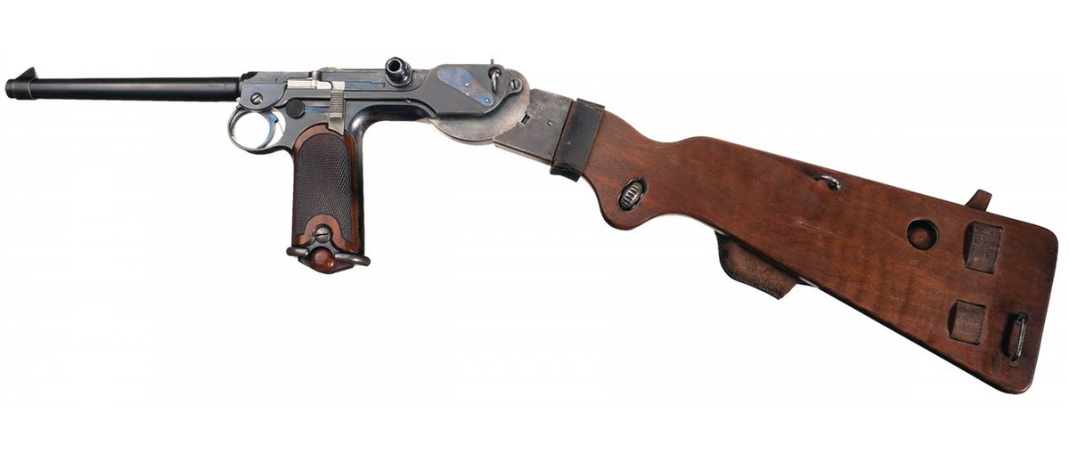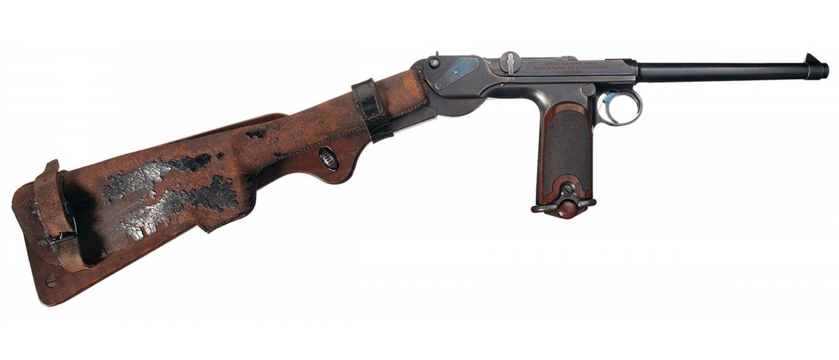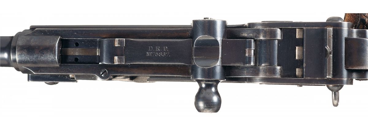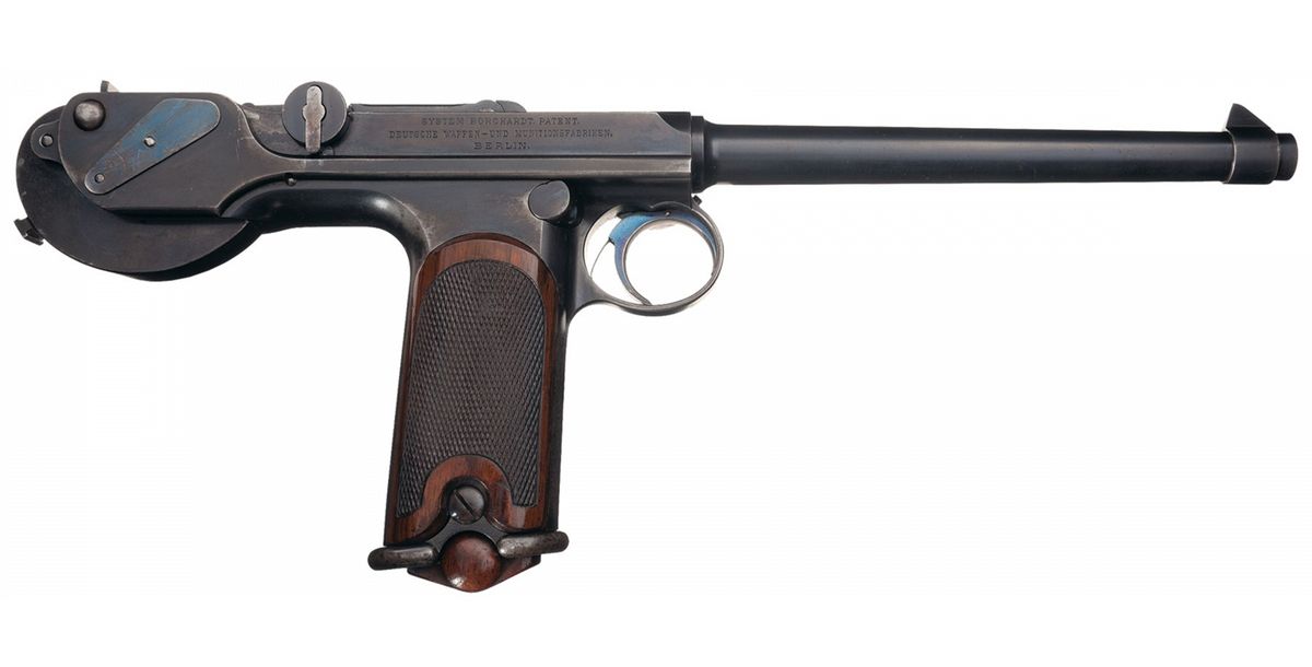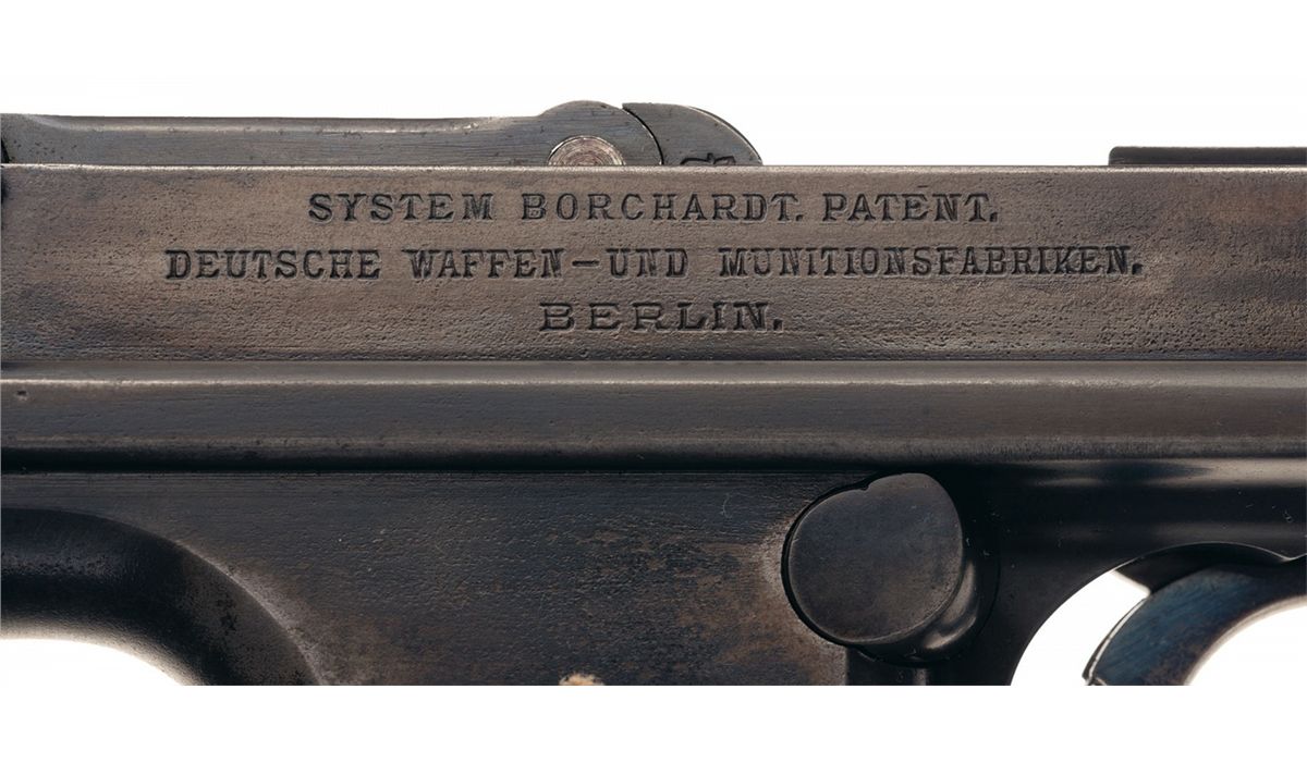 This is a solid example of an 1893 Borchardt semi-automatic pistol that was manufactured by DWM. The Borchardt was the direct forerunner for the Luger pistol (this example was even made by the same company DWM) that featured a toggle bolt and distinctive grip in the center of the frame. The pistol is complete with an original attachable walnut stock and black calf-skin holster that attaches to the stock. The top of the toggle is roll-stamped: "D.R.P./No.75887" in two lines. The right side of the receiver is roll-stamped: "SYSTEM BORCHARDT. PATENT./DEUTSCHE WAFFEN-UND MUNITIONSFABRIKEN./BERLIN" in three lines. "Crown/B", "Crown/U" and "Crown/G" German commercial proof marks are stamped on the left side of the barrel. "Crown/B" and "Crown/U" proofmarks are stamped on the left side of the receiver near the chamber and on the left side of the toggle. The serial number, "1681" is stamped on the underside of the barrel, the rear toggle link, the left side of the trigger, and on the underside of the butt. The magazine is numbered "1232". The front grip strap has been numbered "5786", the significance of this is unknown. The Borchardt semi-automatic pistol is beautifully made. It is historically significant as one of the first successful semi-automatic pistols and the predecessor of the Luger pistol.