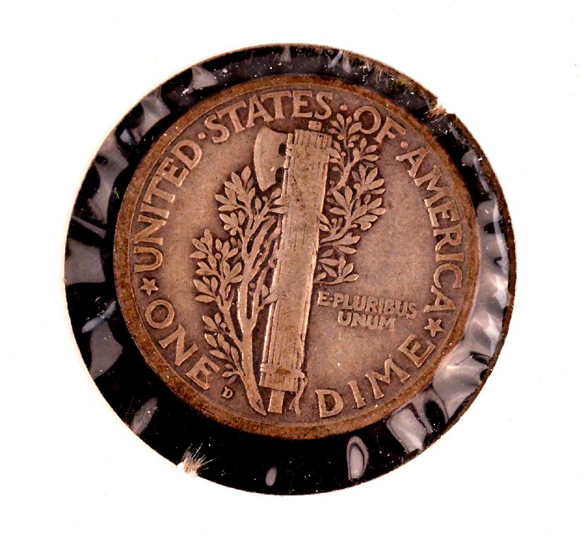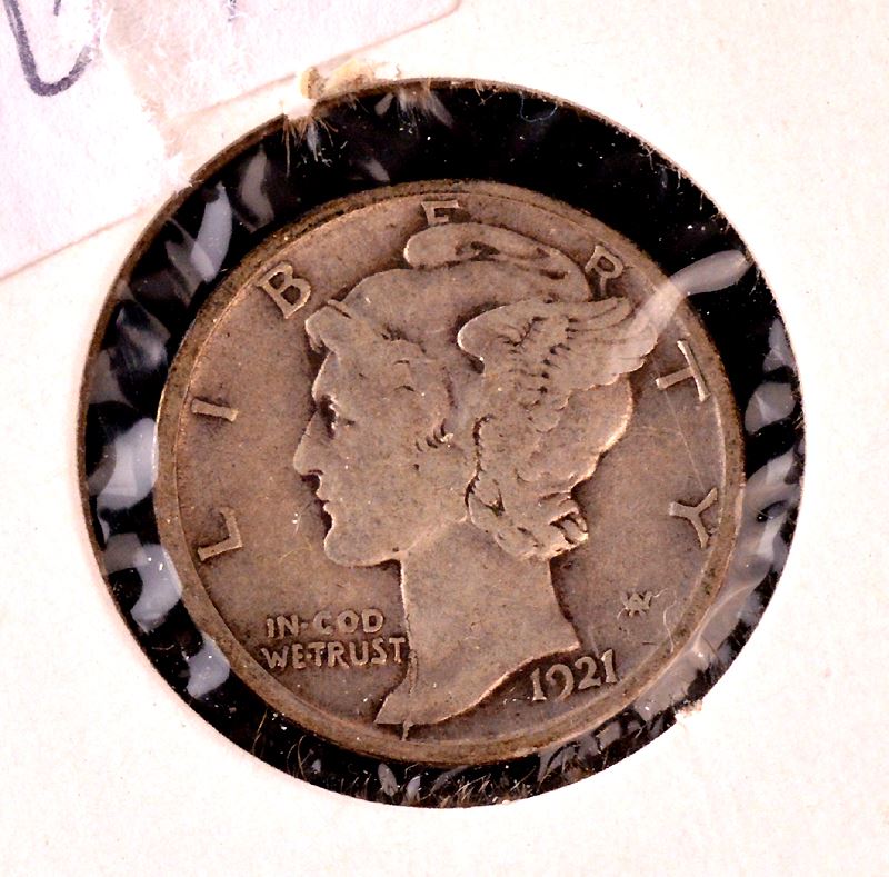 United States, Dime, 1921-D, Fine. Nice die break at bottom, on obverse.