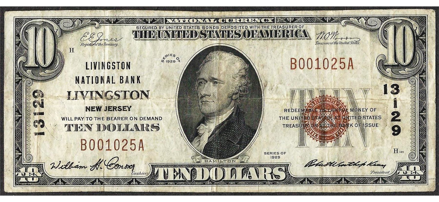 Scarce 1929 $10 Livingston, New Jersey CH# 13129 National Currency Note