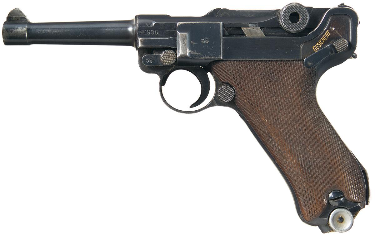 This is an example of a commercial Luger produced in the post 1940 time frame. These were standard Lugers that interspersed with the military contract pistols that were intended for either commercial or contract sales. The only markings on the entire pistol is a Mauser Banner logo on the rear toggle, and a single small Eagle Nazi (1940 era) commercial proof on the left side of the barrel extension. The serial number is stamped on the various parts of the pistol, with the frame being the only part to carry the complete serial number , while the rest of the parts have only the last two digits with the barrel being unnumbered . It has the standard checkered walnut grips with a single blued matching serialized aluminum base magazine.