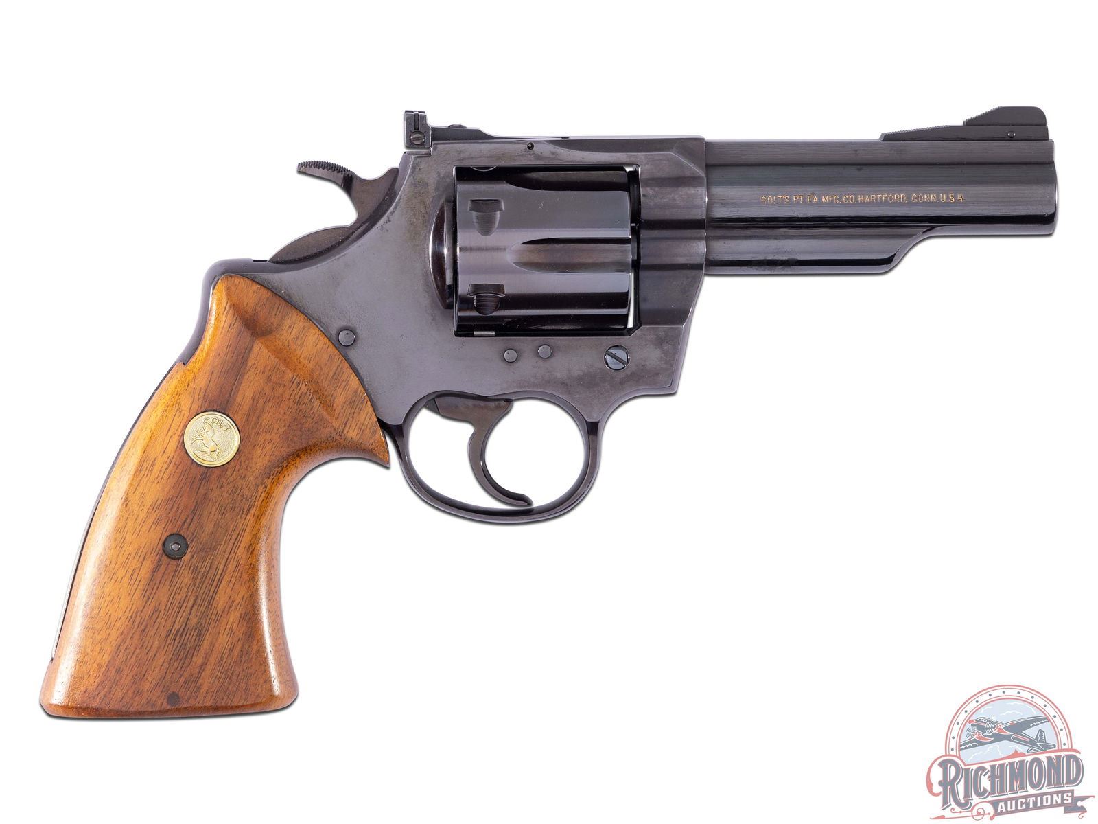Manufactured in 1971. This 2nd issue Border Patrol single/double action revolver is one of only 5,356 blued guns made between 1970 and 1975 for both the U.S. Border Patrol services and the commercial market. Built on Colt's Trooper Mk.III "J" frame it features a 4" barrel with adjustable rear notch and ramp front sight. Six round, fluted swing-out cylinder chambered for .357 Magnum or .38 SPL cartridges. Blued finish with beige highlighted stamping. Left side barrel is stamped "COLT BORDER PATROL / * 357 MAGNUM CTG. *" and a single line Colt address on the right side. Rampant Colt logo is also highlighted in beige on the left side of the receiver. Fitted with smooth Colt factory walnut grips with gold tone medallions. CALIBER: 357 MAG. S/N: J66230. FFL STATUS: Curio & Relic.