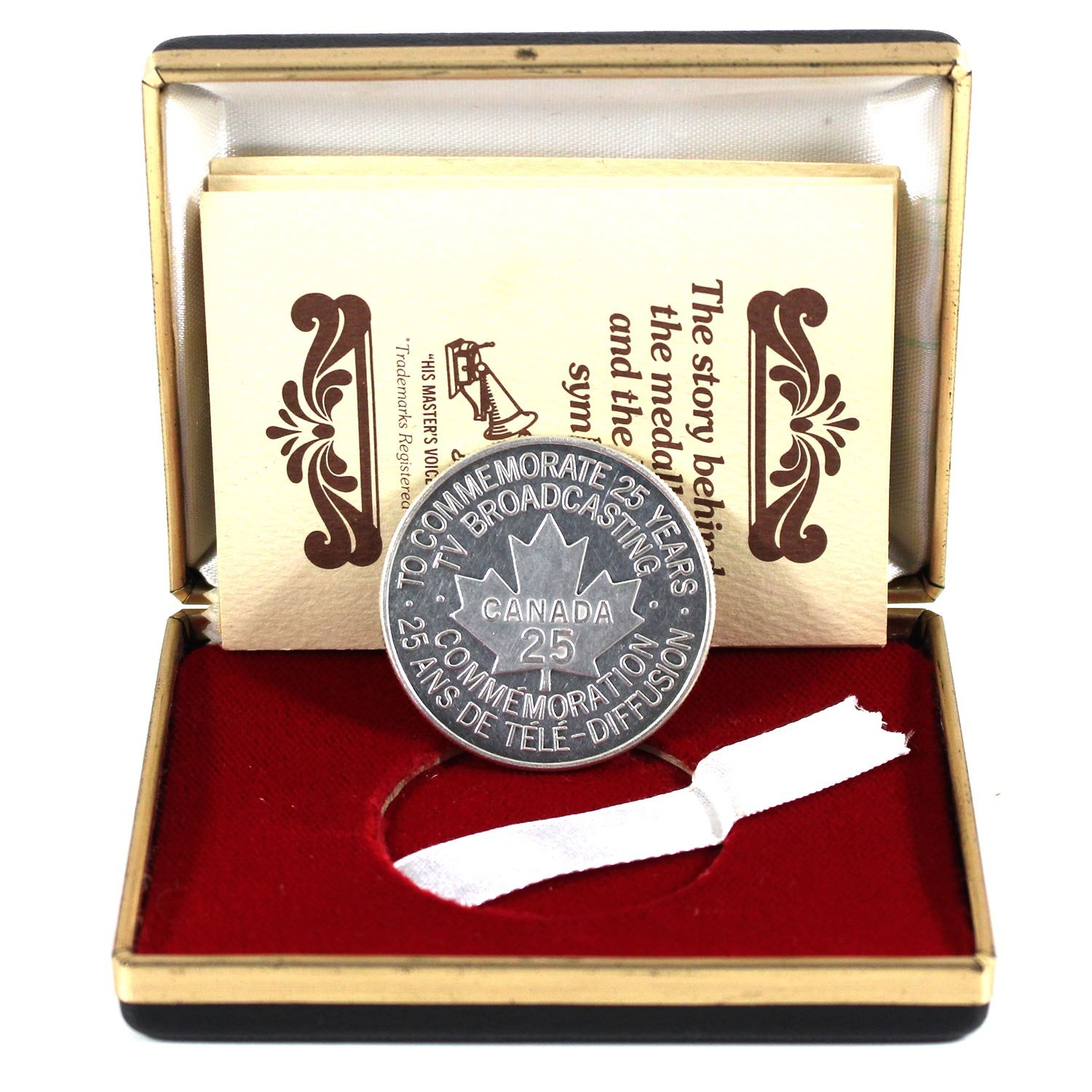 Scarce! 1977 RCA "His Master's Voice" 25 Years of TV Broadcasting in Canada 1oz .999 Fine Silver Commemorative Coin in Plastic Holder and Original RCA Box with COA. Only 6500 minted by the Sherritt Mint in Toronto! (TAX Exempt)