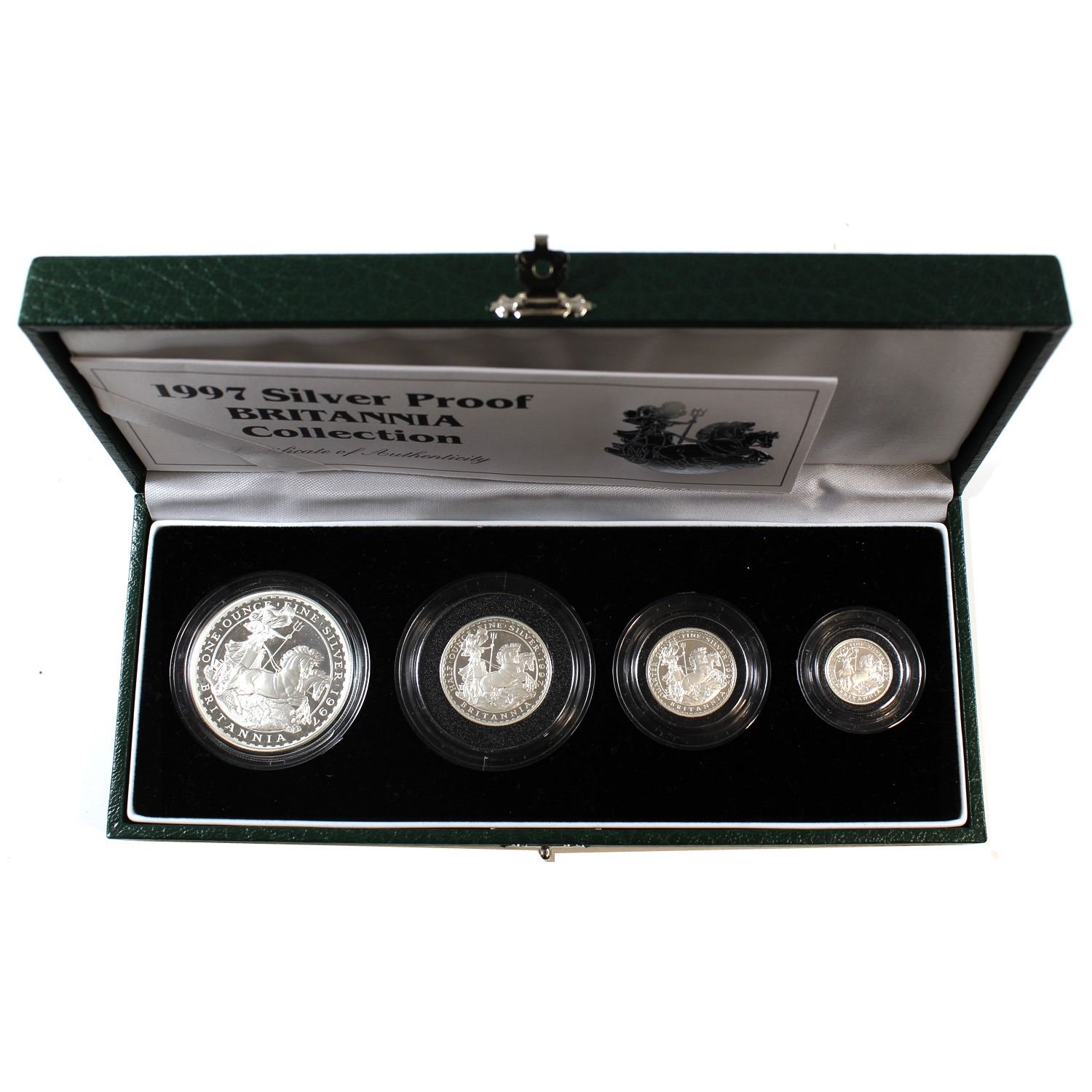 Scarce 1997 Great Britain 4-coin Britannia Fine Silver Proof Collection. You will receive 1oz, 1/2oz, 1/4oz & 1/10oz Britannia Proof coins. Mintage of only 15000! (TAX Exempt)
