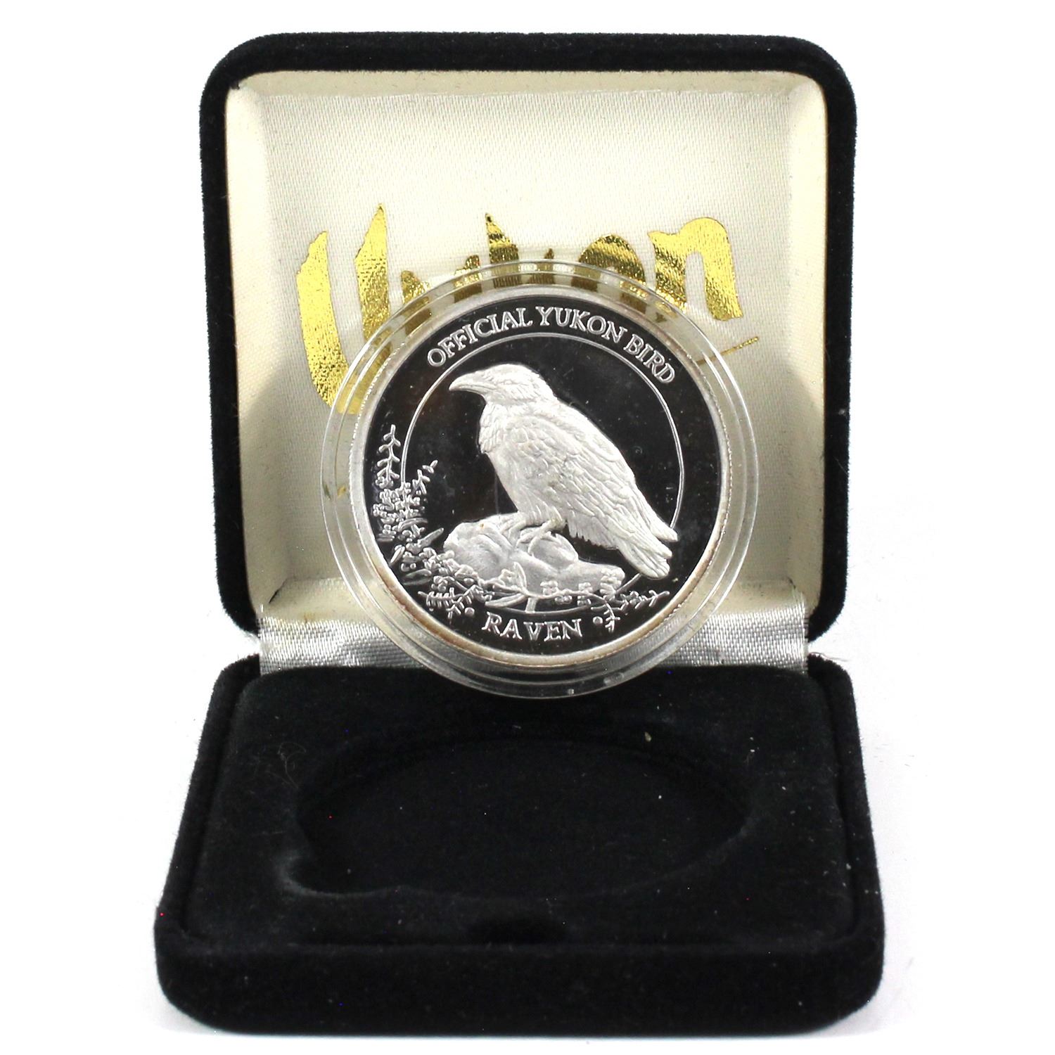 Scarce! 1oz Yukon Territory Raven Official Yukon Bird and Coat of Arms .999 Fine Silver Round Encapsulated in Original Yukon Display Box (Lightly toned, capsule lightly scratched). TAX Exempt