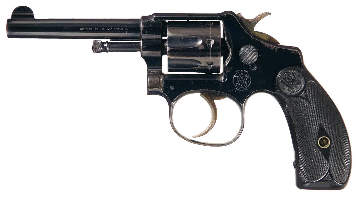 Approximately 4,575 of these 1st Model revolvers were manufactured between 1902 and 1906. They were primarily made as a defensive weapon for women. Fixed sights, with the two line address/patent dates flanked by Maltese crosses on top of the barrel, one line caliber marking on the left side and the small Smith & Wesson logo on the left side of the frame. Fitted with the distinctive checkered circular cylinder latch on the left side of the frame, a pinned barrel, 7-round fluted cylinder, casehardened hammer and trigger, and fitted with checkered hard rubber grips with a diamond pattern around the screw, patent date on the lower left panel and "S&W" in a circle at the top.