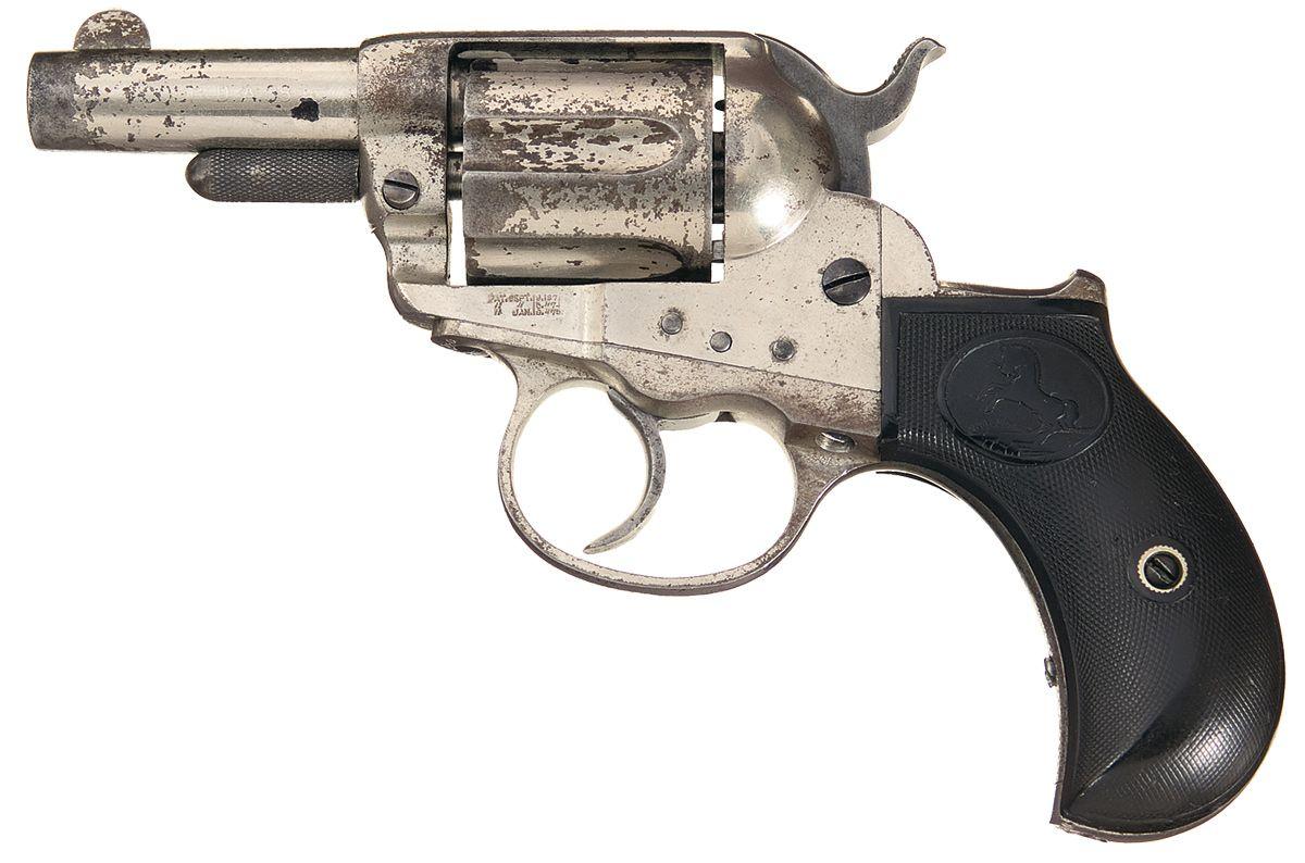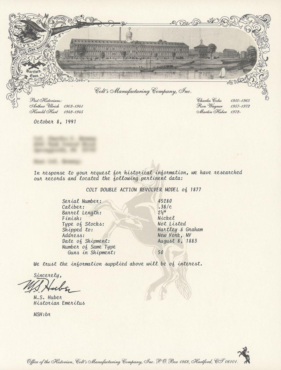 Standard markings and features, with scarce 2 1/2 inch barrel. Complete with factory letter that verifies the serial number and configuration, with the stock as "Not Listed", and states that the revolver was shipped to Hartley & Graham, New York City, New York, on 8 August 1883 in a shipment of 50 guns.