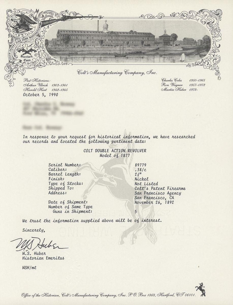 Manufactured in 1892, with standard markings and features, matching serial numbers, scarce 2 1/2 inch barrel without the ejector rod and fitted with smooth two piece ivory grips. The accompanying factory letter verifies the serial number and configuration, with the grips as "Not Listed" and that it was shipped as 1 of 5 to Colt's Patent Firearms, San Francisco Agency, San Francisco, Ca. on November 26, 1892.