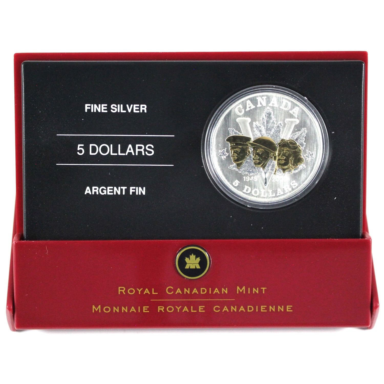 Scarce!!! 2005 Canada $5 End of WWII 60th Anniversary with Double Maple Leaf Privy Mark Fine Silver Coin with Gold Plating Encapsulated in Red Hard Plastic RCM Display Case. This coin was part of a 6-coin set from different countries made by the Royal Mint. The gold plating on this coin may have been a custom job. (TAX Exempt)