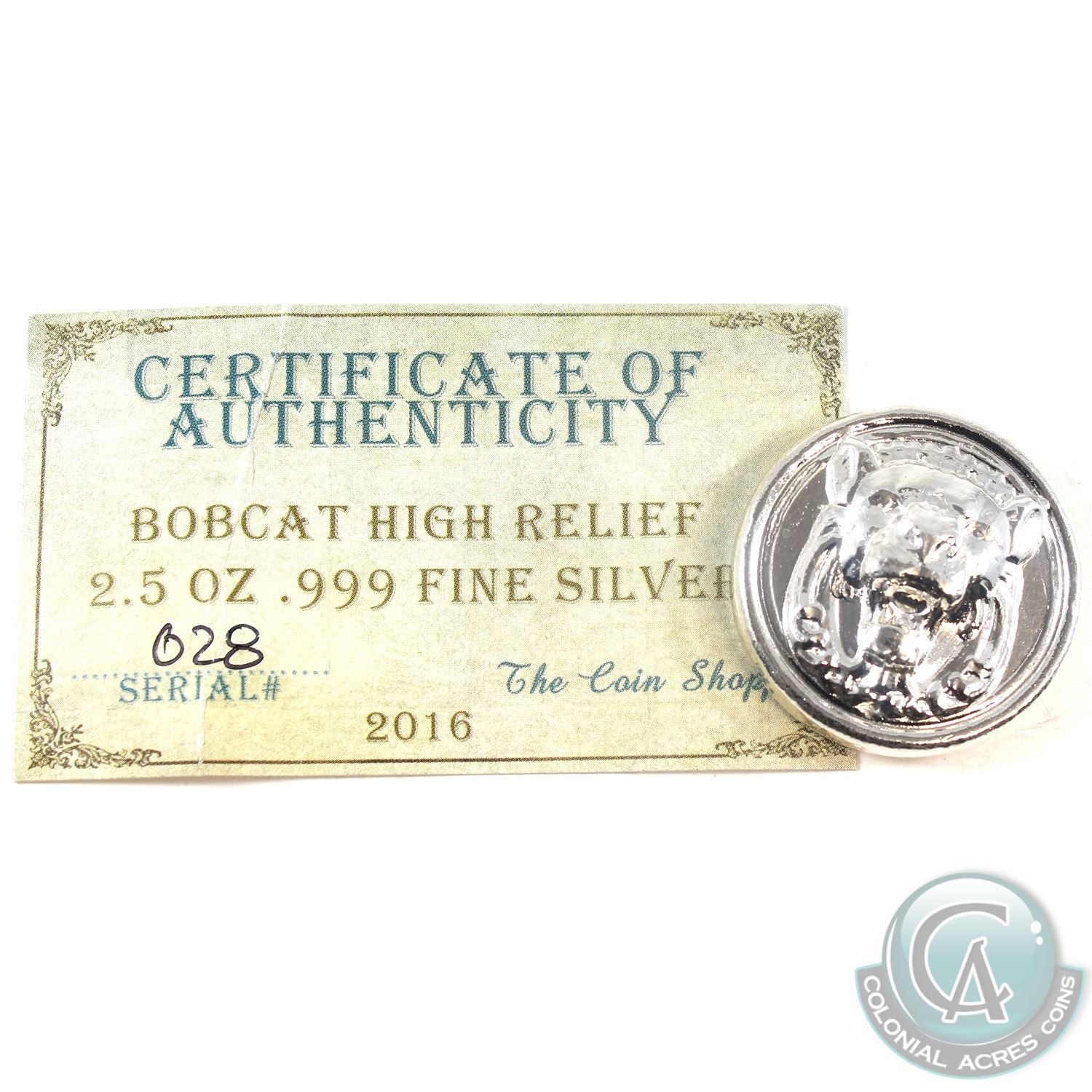 Scarce 2016 The Coin Shoppe 2.5oz Bobcat High Relief Hand Poured Round with COA - #028 of ONLY 100! (Bent COA). (TAX Exempt)