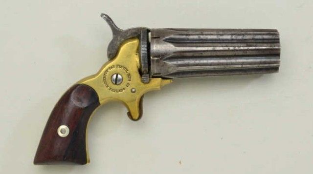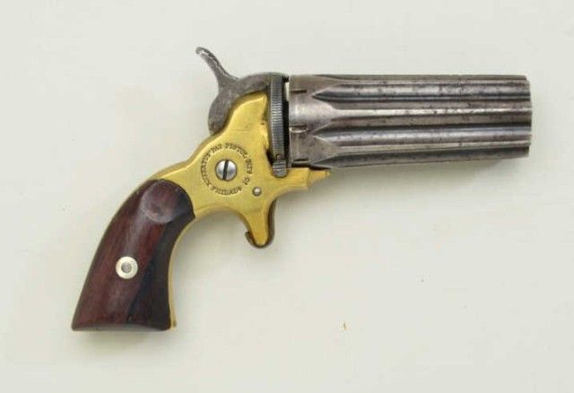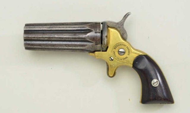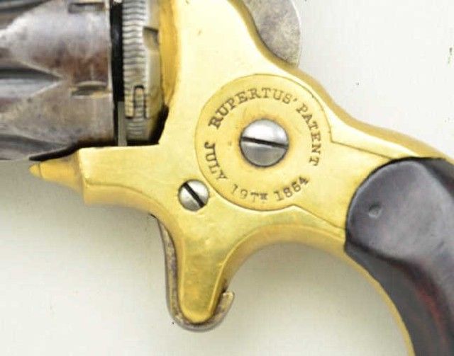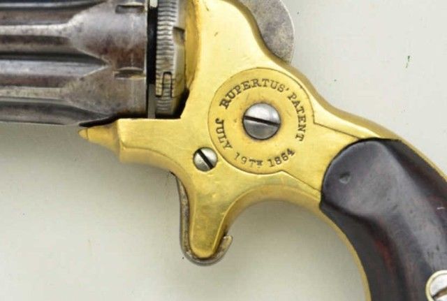 Scarce 22 cal pepperbox derringer by “Rupertus” showing 8 shot barrel cluster, blued finish, brass frame, wood grips, serial #2572. The barrels show 20-30% blue drifting to patina with some very lightpitting and erosion and some storage marks. The brass frame is good with sharp patent markings. The grips are good with some normal wear. The hammer shows considerable case hardening and the action is working.From an old N.Y collector’s estate. Est.;$700-$1,400.