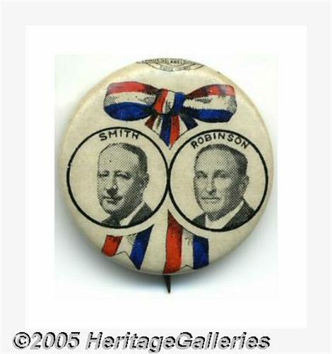 <B>Scarce 7/8" 1928 Smith - Robinson Jugate</B></I> Found with both gold and white backgrounds, this is the scarcer variety. This variety is prone to spotting in the white field, but the present example is choice. Lot:263