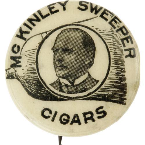 <B>Scarce 7/8" McKinley Button, Combining a Political Message with Cigar Advertising.</B></I> The "clean sweep" was a popular political theme in the 1880s and 1890s, and it is not surprising that someone sought to exploit this motif. Condition is basically choice, with a couple of very trivial light soil marks in the field, noted for accuracy. <I>From the Norman Loewenstern Collection.</B></I>