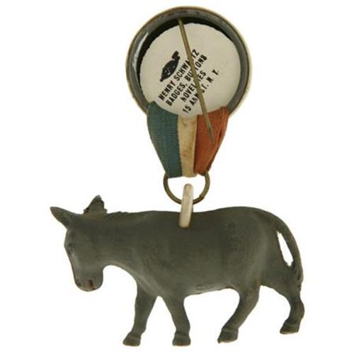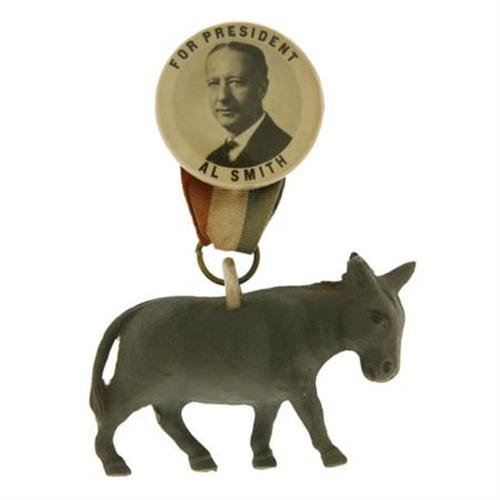 <B>Scarce Al Smith For President Campaign Pin</B></I> 1 1/4" celluloid pin in great shape. This particular variety is hard to find and includes the original celluloid donkey still intact. A very crisp picture of Smith is centered on the button which measures totally 3 1/2 " in length.<BR><BR><b>Shipping:</b> Miscellaneous Collectibles, Smal (<a target="_blank" href="http://www.heritageauctions.com/common/shipping.php">view shipping information</a>)