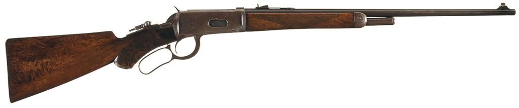 Manufactured in 1896, this special order Model 1894 rifle features a 22" extra light tapered round barrel (extremely rare on this early production model 1984; quiet possibly one of the earliest known) with a ramped Lyman blade front, adjustable rear sporting and tang mounted short range peep sights. The top of the barrel ahead of the rear sight is marked with the two-line address, to the left of the rear sight is marked with the nickel steel marking and the top breech end is marked "30 W.C.F.". The serial number is marked on the bottom of the frame. Half magazine and mounted with nicely figured checkered walnut correct short and slender forearm with steel forend cap and pistol grip stock with hard rubber Winchester grip cap and steel shotgun style buttplate.
