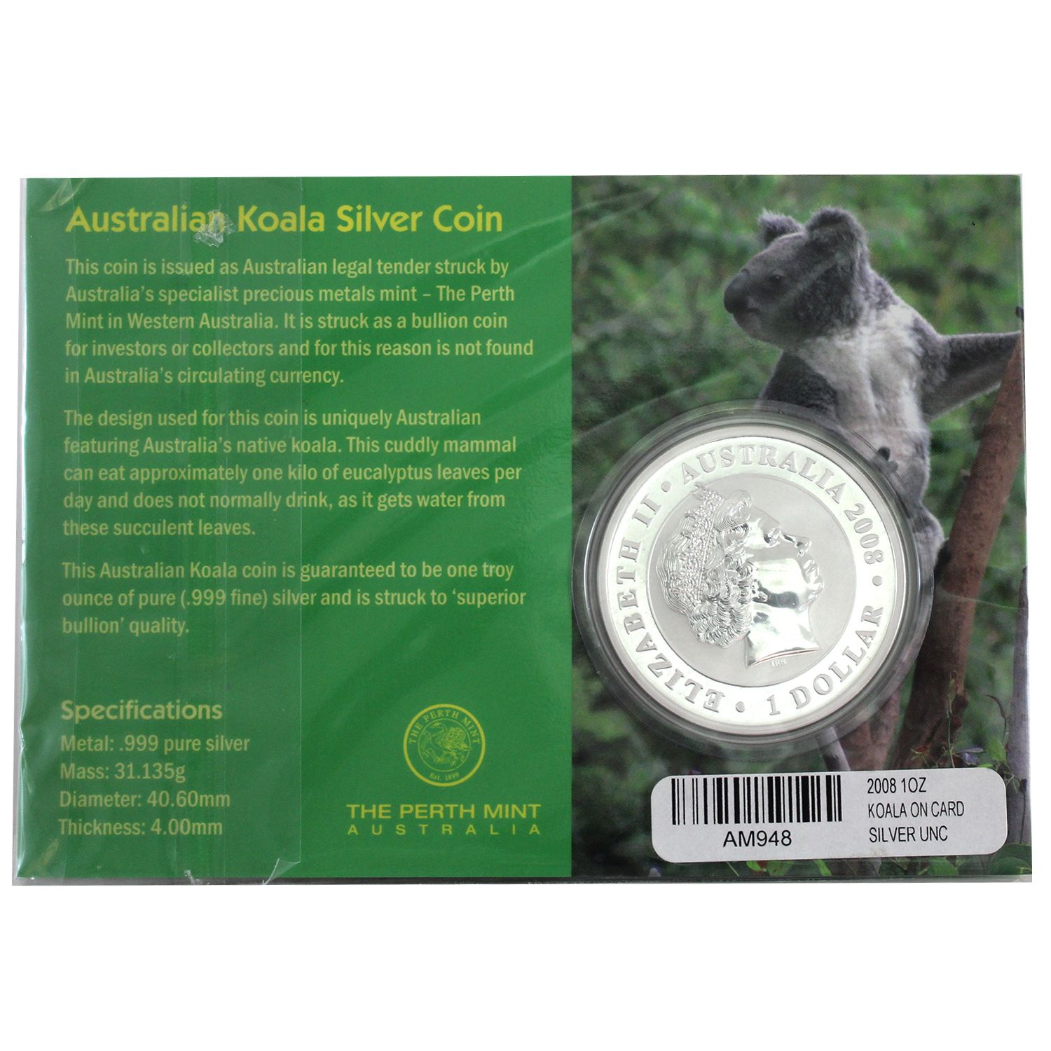 1oz Fine Silver. By far the lowest mintage Koala at only 84,057! (Tax Exempt)