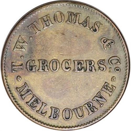 <B>Scarce 1854 Australian Merchant Halfpenny Token Uncertified.</B></I> KM-Tn-248. Copper. Halfpenny token issued by T.W. Thomas & Co., a nice chocolate-brown example in VF/XF. The current catalog value is approximately $900. <BR><BR><b>Shipping:</b> Coins & Currency (<a target="_blank" href="http://www.heritageauctions.com/common/shipping.php">view shipping information</a>)