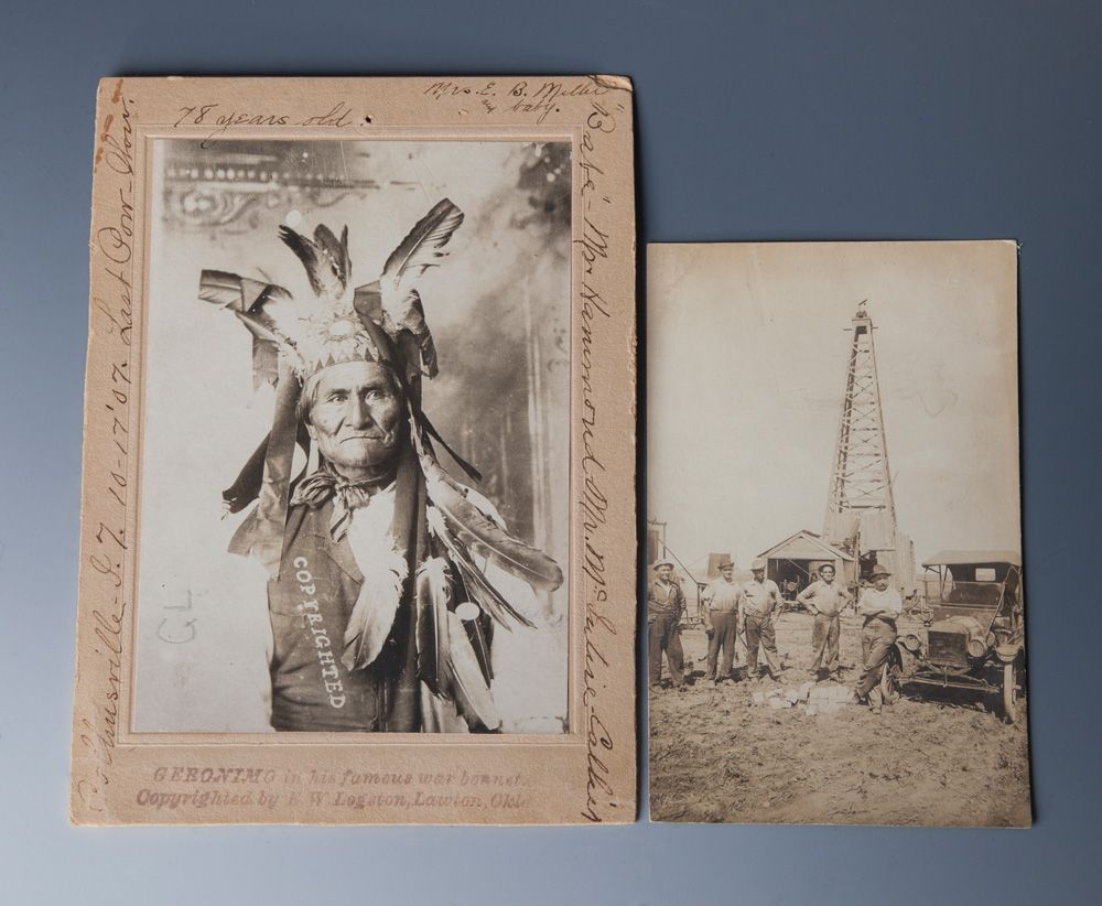 Scarce Autograhed Geronimo Photo by E.W. Logston, Lawton, OK. Scarce gelatin silver photograph of Geronimo. Stamped in the lower margin: “GERONIMO in his famous war bonnet. Copyrighted by E.W. Logston, Lawton, Okla.” Signed in pencil on the reverse “GERONIMO” in his unique style, with some of the writing worn away. It appears he started to sign the front on the image itself (lower left) but stopped after G and a portion of the E. The outside margins on the front of the card mount have the owner’s notations along with the place and date acquired "Collinsville - I. T. 10-17 '07. Last Pow Wow.". 4” x 5.5” on 5.125” x 7.125” mount.