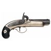 Operating between 1839 and 1851, the partnership between Orison Blunt and the Syms brothers, William and Samuel, was best known for the production of pepperbox, sidehammer, and underhammer pistols. This particular model, typically seen with a cast iron frame, forearm optional, is instead made from cast German silver with integral matching forearm, showing scroll engraving on the sides and top of the frame, sunburst pattern at the tip, simulated wedge escutcheons, and a ray pattern on the bolster. The hammer and lockplate are also scroll engraved. Fitted with a bronze tipped ramrod and checkered bag shaped grips. In a green felt lined hardwood case with a Goldmark/Winchester cap tin, loose cast balls, a powder measure, key and a nipple wrench. A plate on the lid is inscribed "1883/J.E.Taylor/Brooklyn".