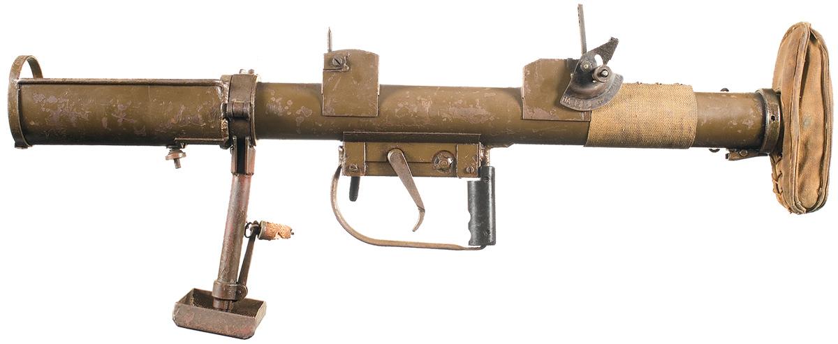 Full nomenclature Projector, Infantry, Anti-Tank, the PIAT is a man portable spigot mortar introduced in 1942 as a replacement for the Boys anti-tank rifle, and would remain in service to 1950. The projectile was launched by way of a large spring driven piston striking the propellant charge in the round, which would have to be manually cocked by the operator before firing. Though the German Panzerfaust/Panzerschreck and American Bazooka weapons were easier to use, the PIAT was easier to produce due to lower pressure requirements, and had reduced blowback compared to the others, increasing concealment and safety when firing in close quarters. Measures 38 1/2" in total length, with the projectile carrier measuring 9 3/8" long, folding pin front and 3-port aperture rear sights, an adjustable monopod, combination trigger guard and handrest with long trigger, right side mounted safety and a grooved pistol grip, canvas cheekpiece and a canvas covered recoil pad on the buttplate. Weapon also comes with an insert adaptor for firing lower diameter cartridges.