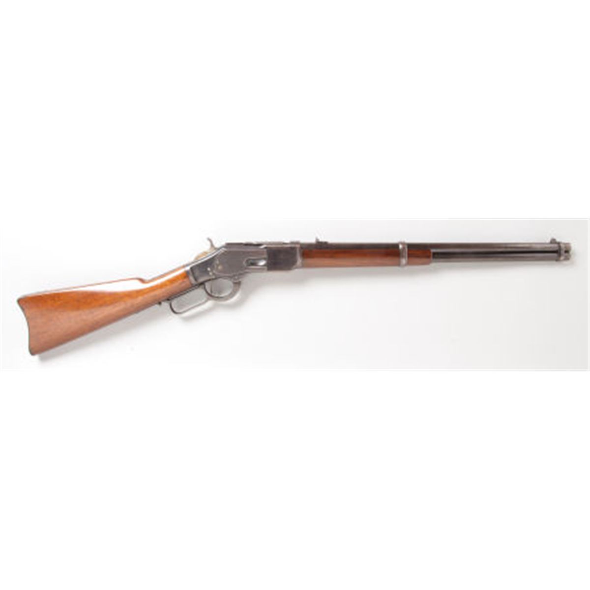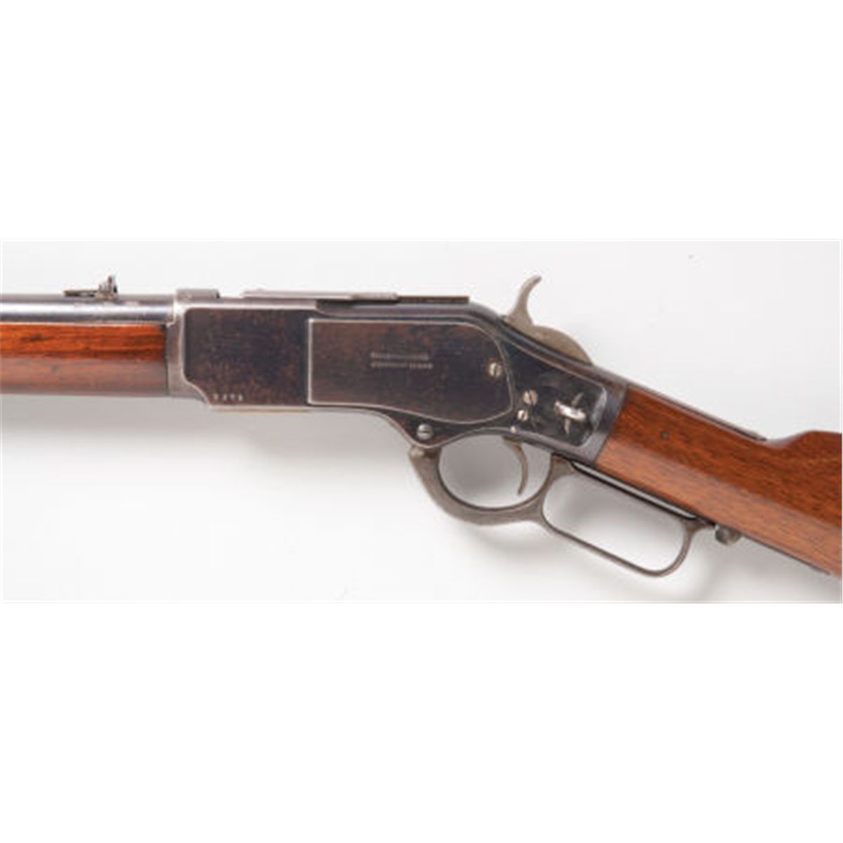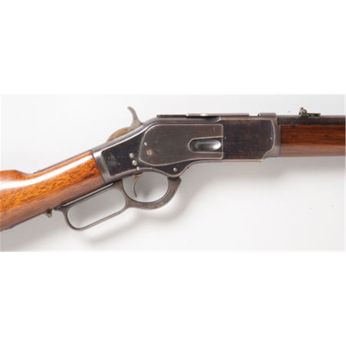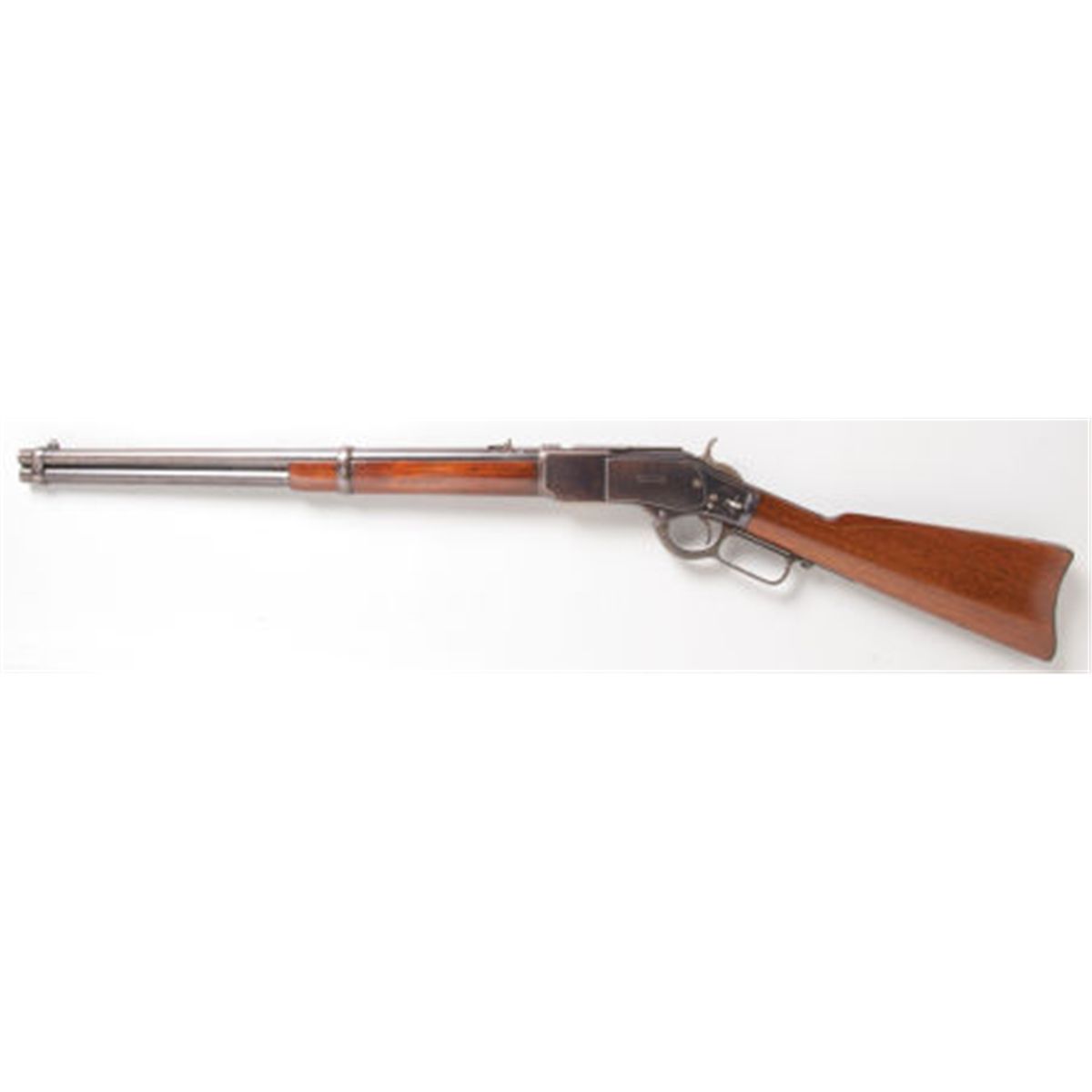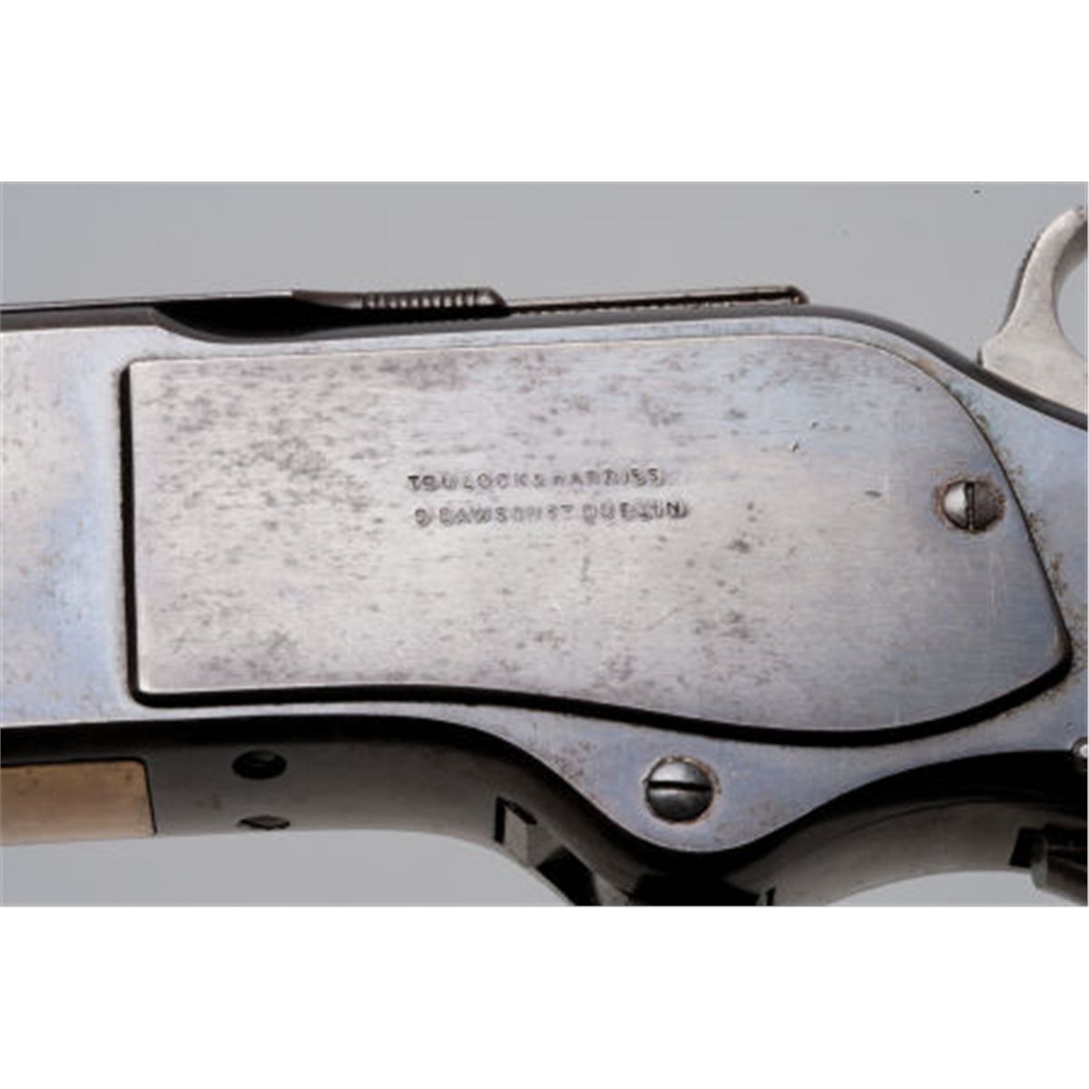 Scarce British-Proofed and Irish Agent-Marked Winchester Second Model 1873 Saddle Ring Carbine. Serial no. 77229, .44-40 caliber, 20-inch round barrel with standard pedestal front sight and two-position folding rear sight. Blued finish. Left side of frame stamped with number 9375 and legend: Trulock & Harriss/9 Dawson St., Dublin. Saddle ring loop. Case-hardened hammer, lever and buttplate. Varnished walnut stock and fore-end. Carbine butt with cleaning rod reservoir. Condition: Excellent. Retaining approximately 75-80% finish with scattered wear, flaking finish and age patina. Faded and silvered case-hardening. Saddle ring missing. Wood excellent. Action tight and crisp.
