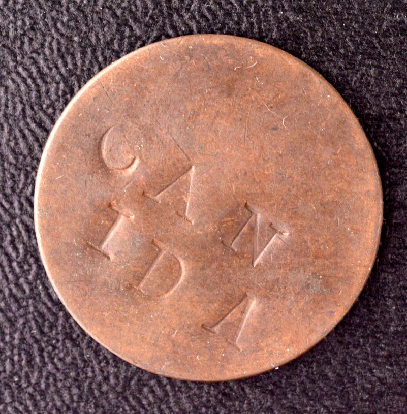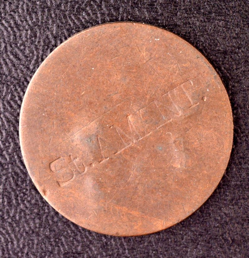 St. AMANT/CAN IDA. Incused on a thin copper planchet. 6.28 grams, 27.3 mm. VF. An obscure and rare token, first referenced by R.W. McLachan in the July, 1889 edition of The Canadian Antiquarian and Numismatic Journal. Unlisted in Breton (1894), although listed in The Scott Copper Catalogue, 1893 edition, and "attributed to the City of Quebec, Canada".