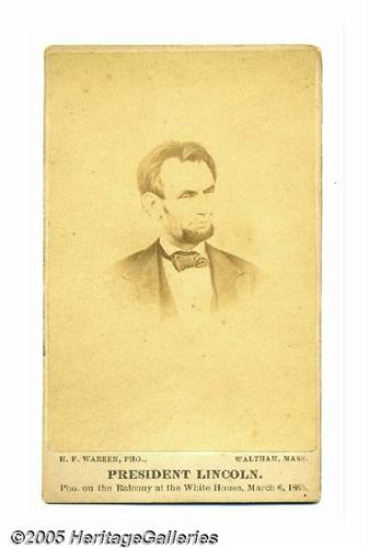 <B>Scarce Carte de Visite of a Vignetted Abraham Lincoln</B></I> By H. F. Warren of Waltham, Massachusetts, taken on the balcony of the White House, March 6, 1865. This is quite a rare specimen as the imprint on the titled mount changed from reading "The Latest Photo" to "The Last Photo" after the assassination just one month later. Some age as shown, otherwise fine. Lot:257